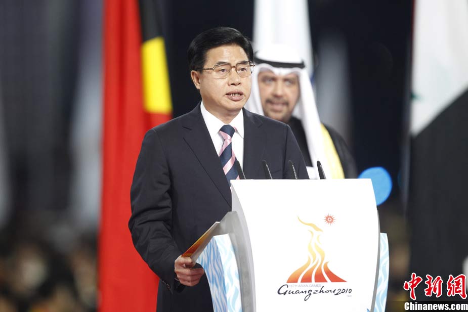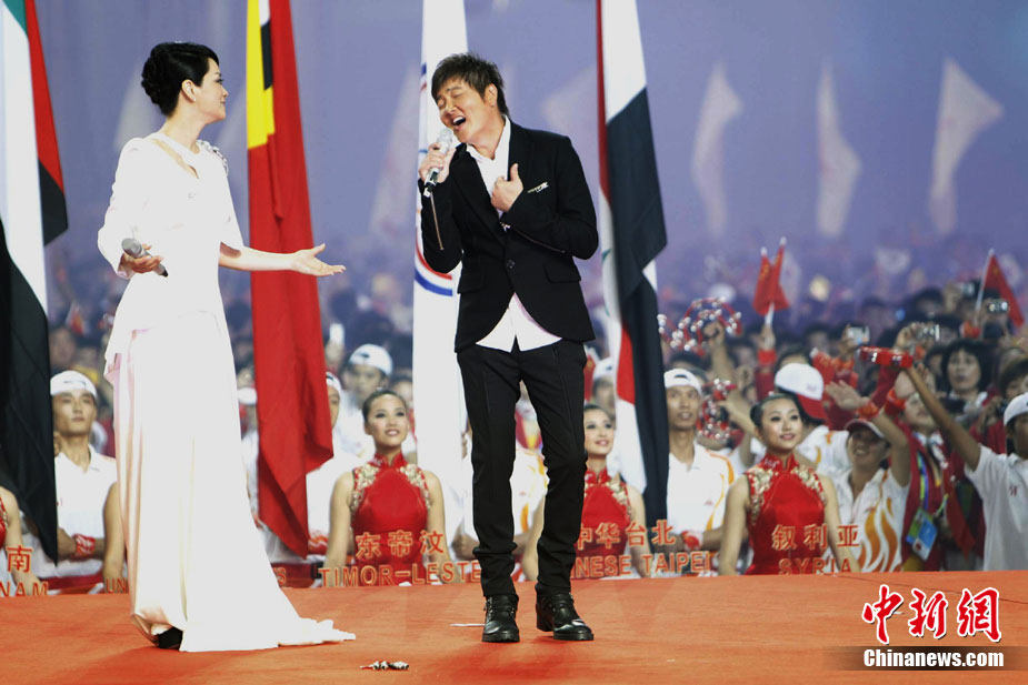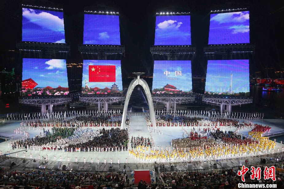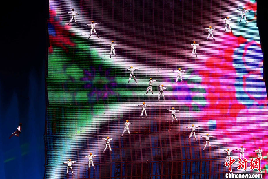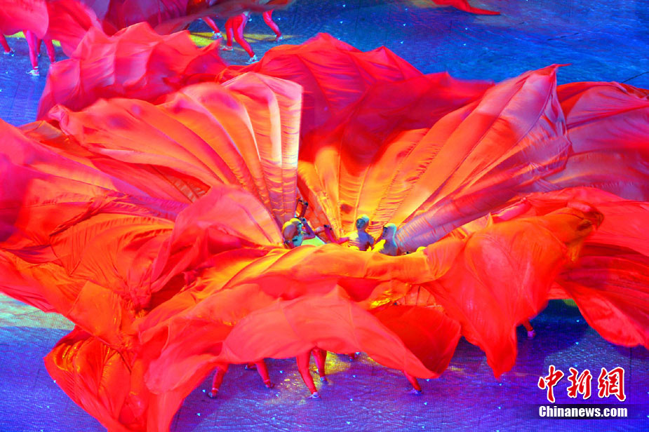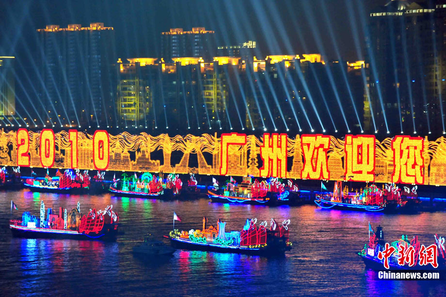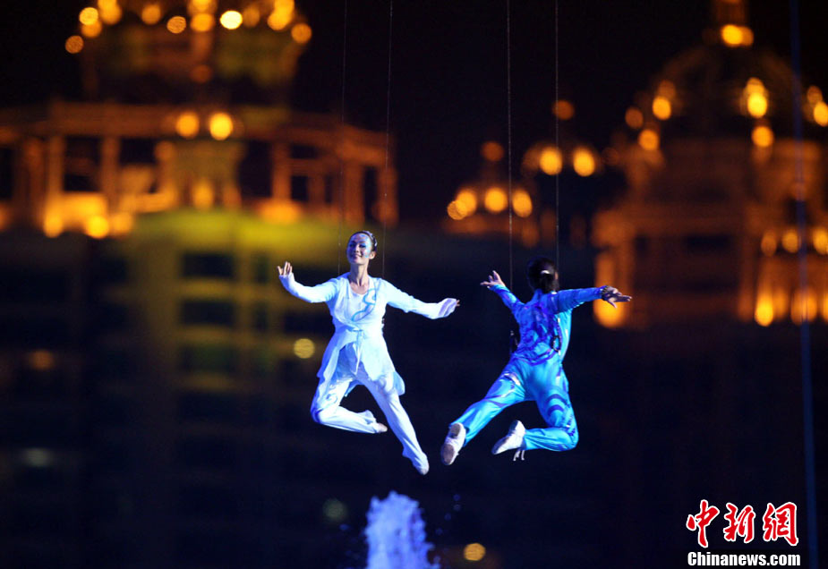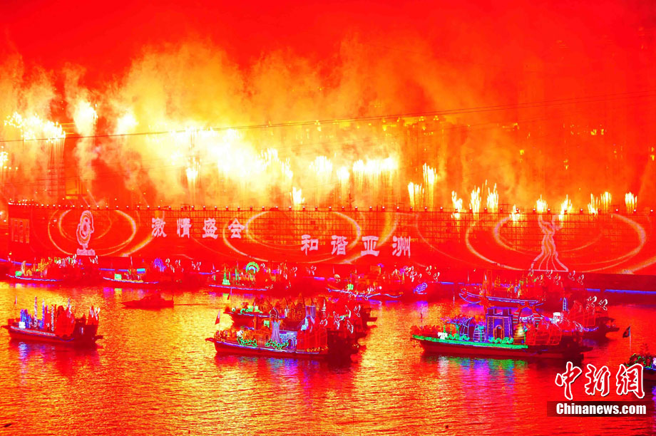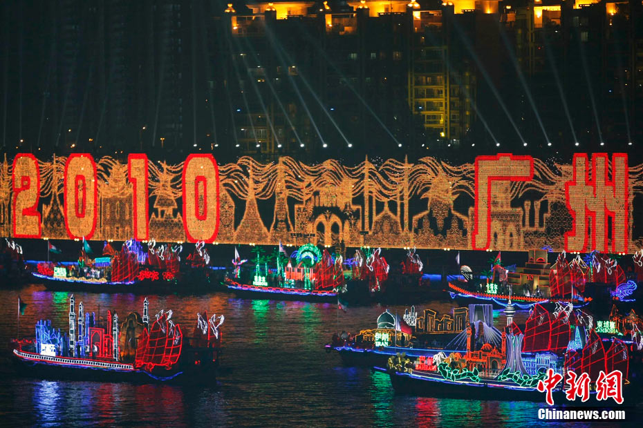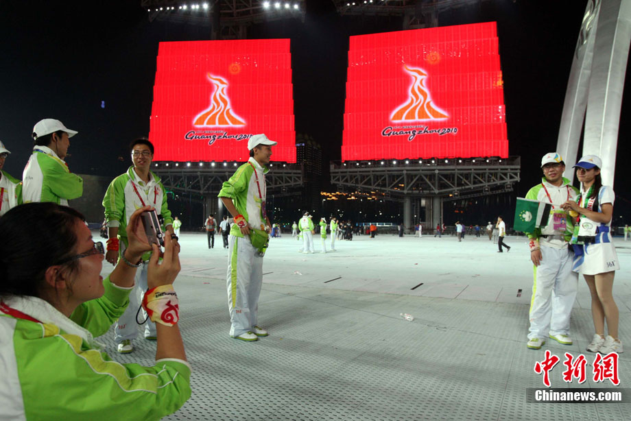11月12日晚,广州亚运会开幕。图为亚运圣火主火炬点燃。中新社记者 富田 摄