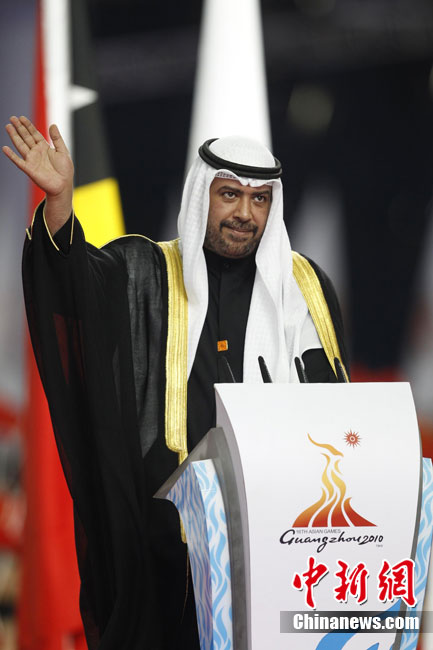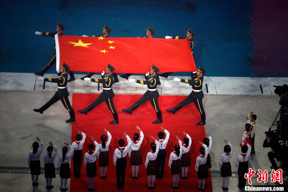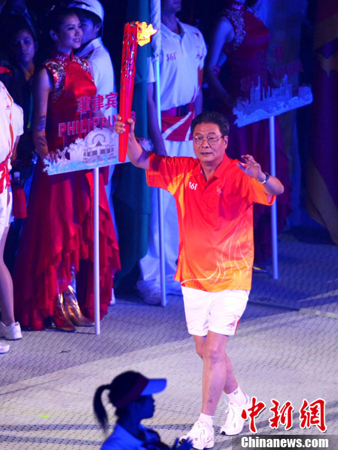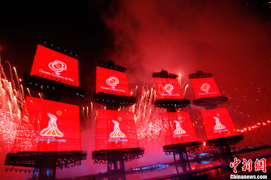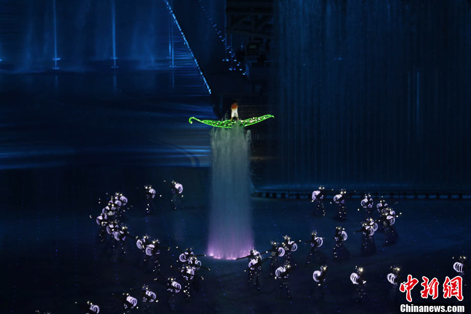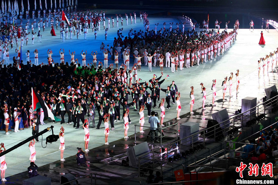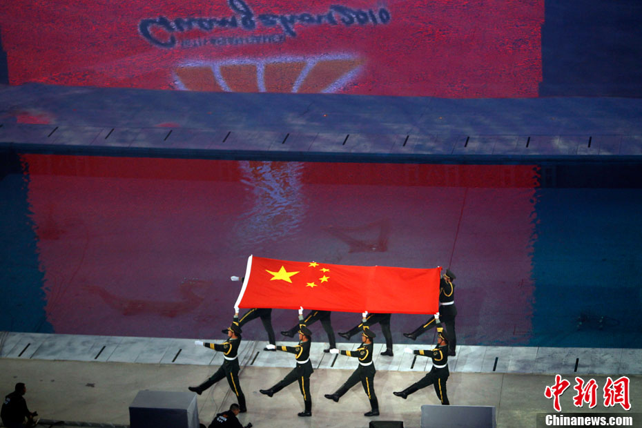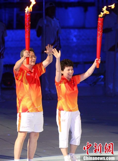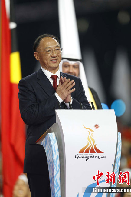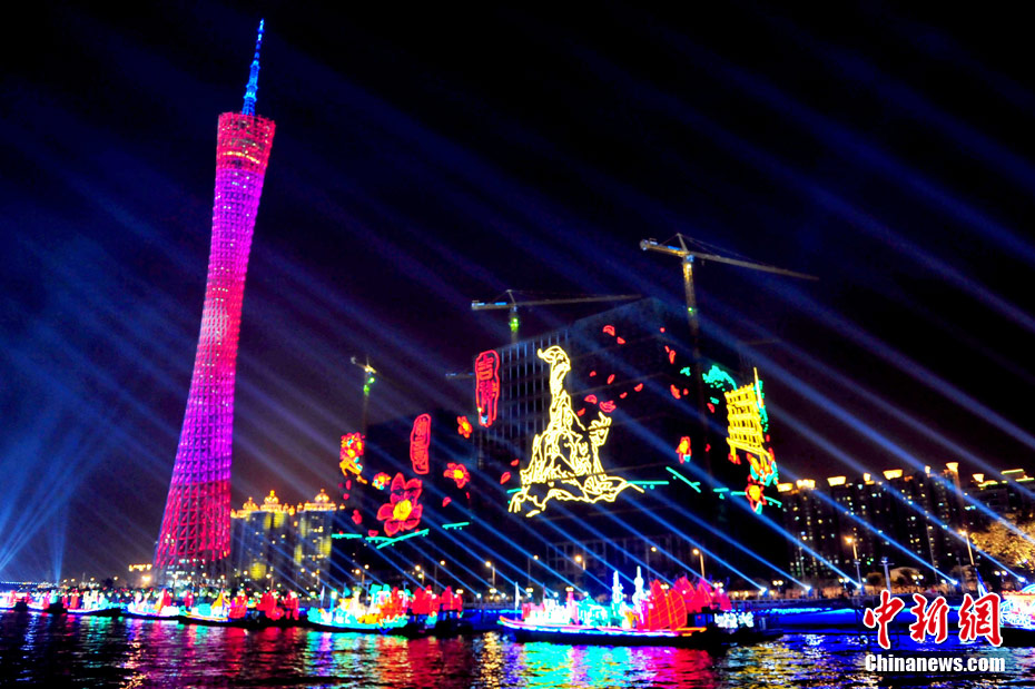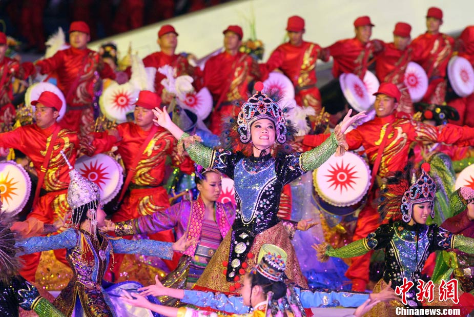 11月12日晚,广州亚运会开幕。图为亚运圣火主火炬点燃。中新社记者 富田 摄