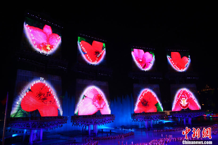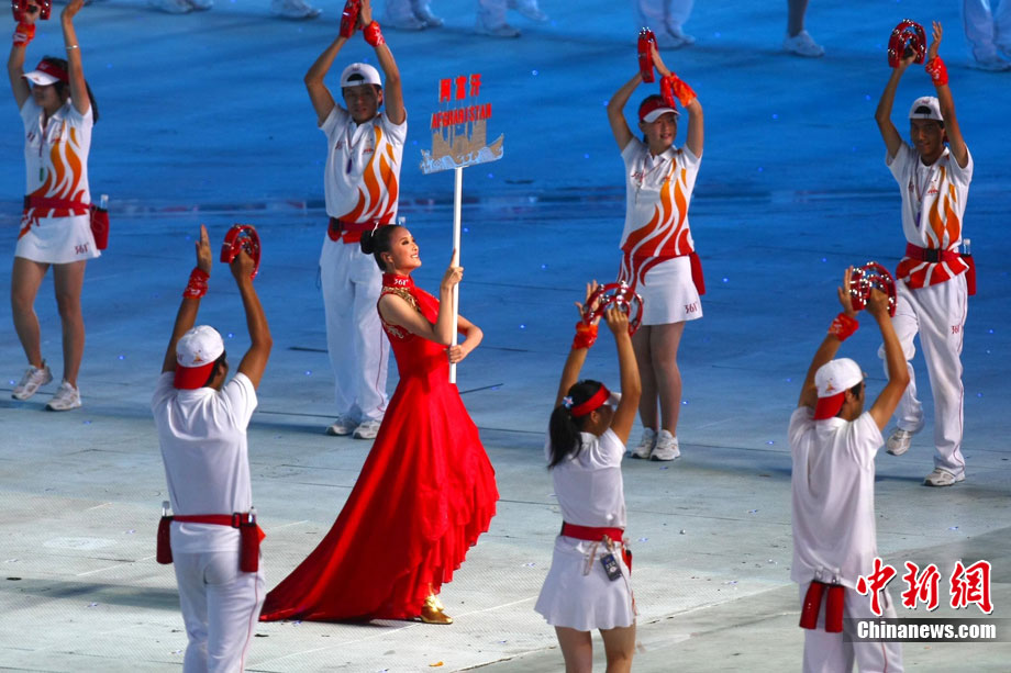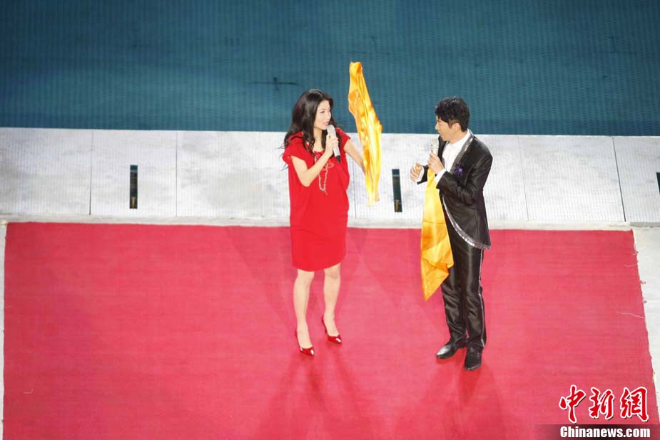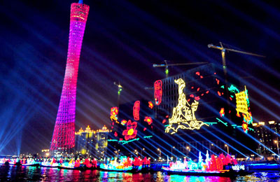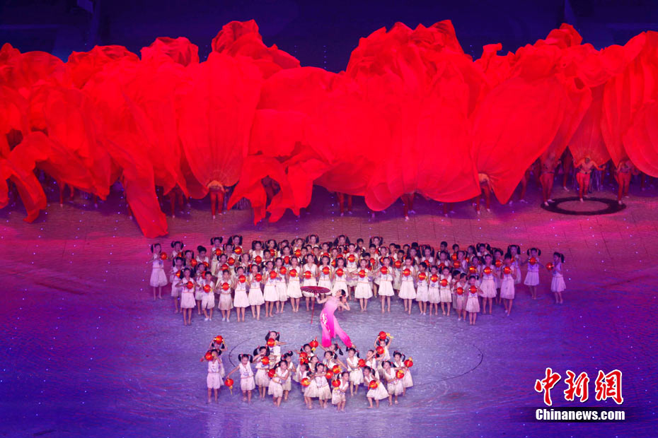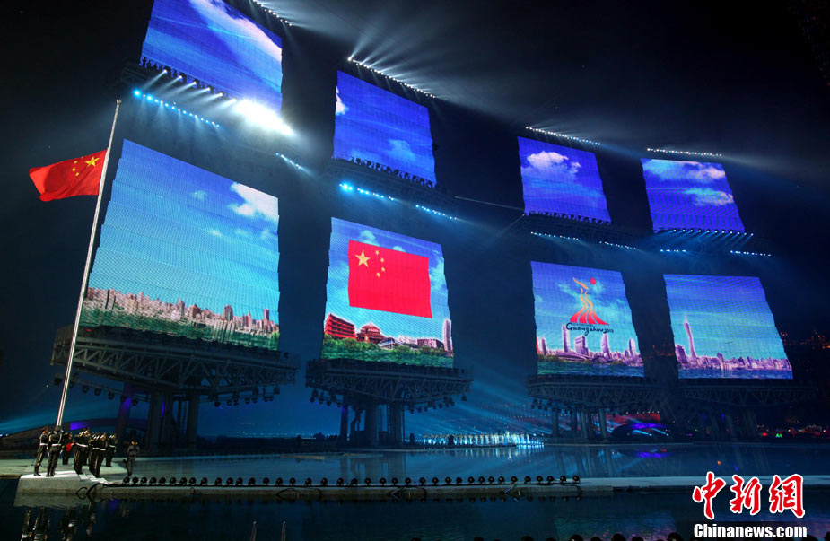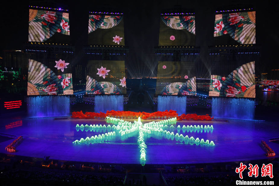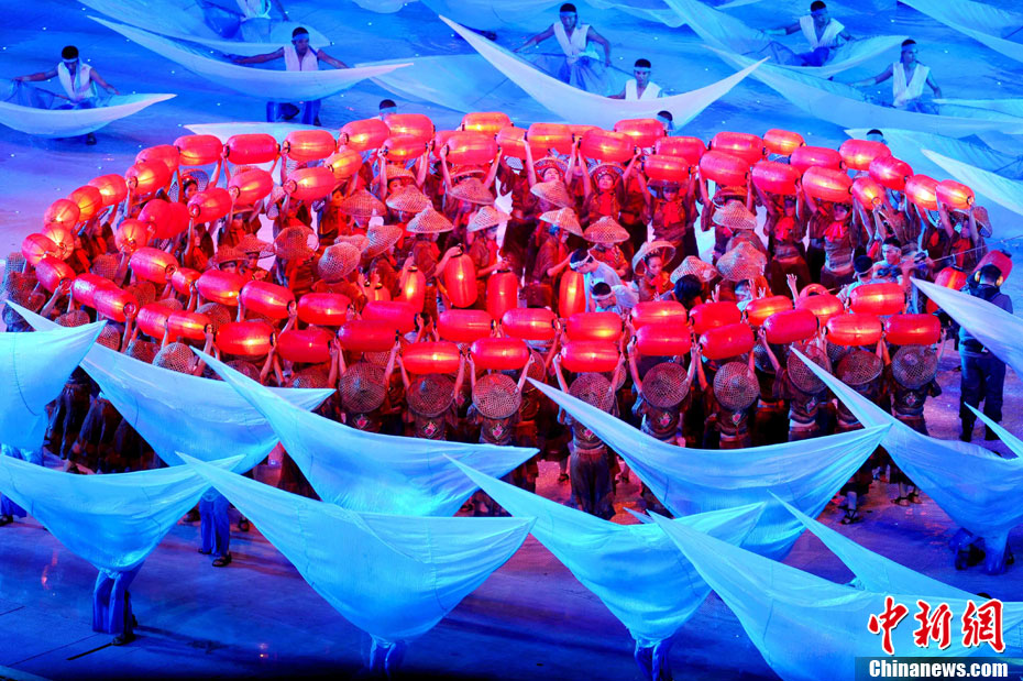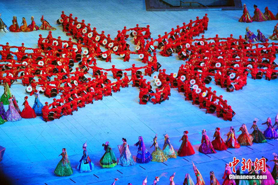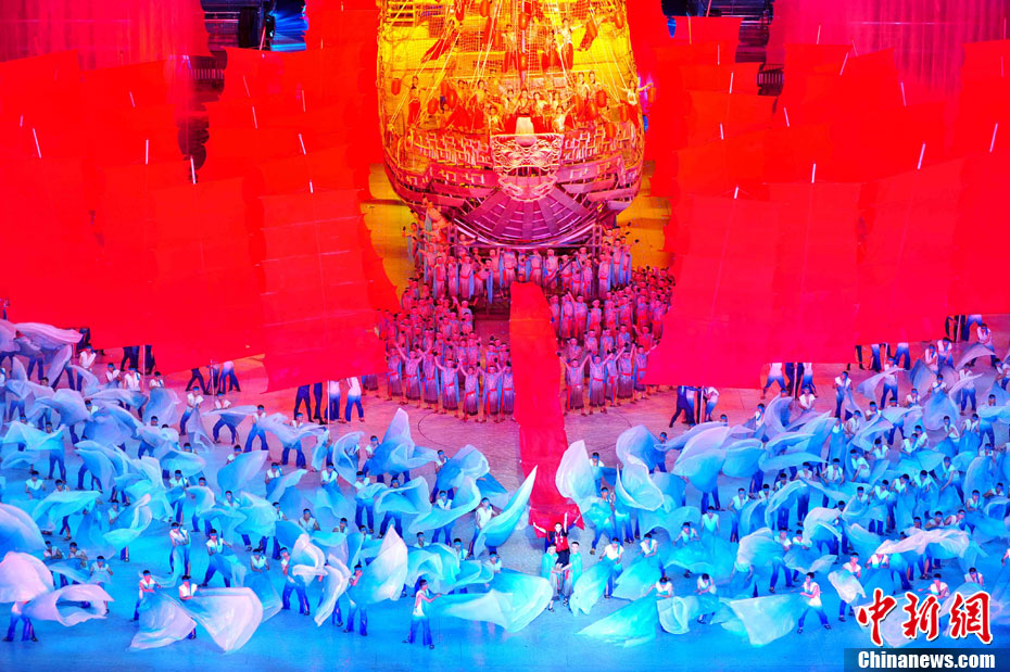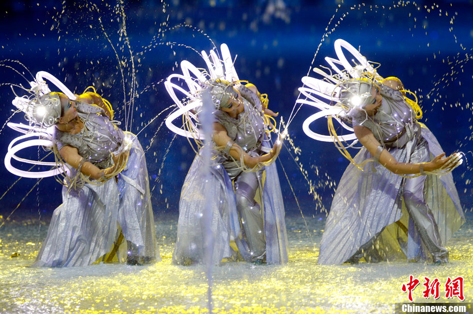 11月12日晚,广州亚运会开幕。图为亚运圣火主火炬点燃。中新社记者 富田 摄