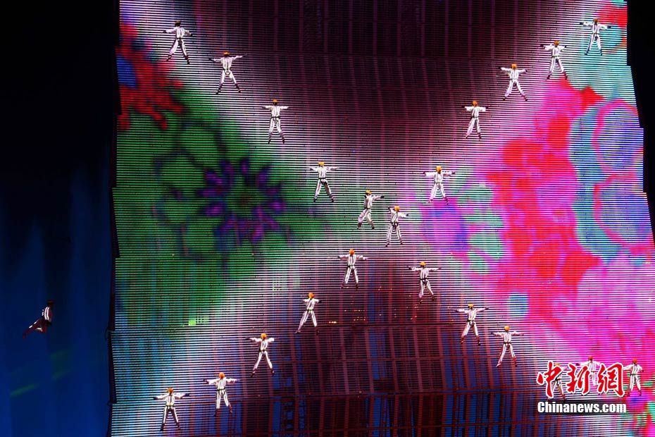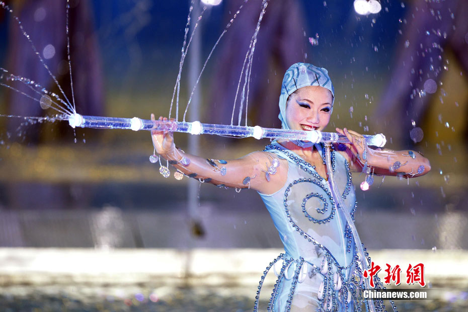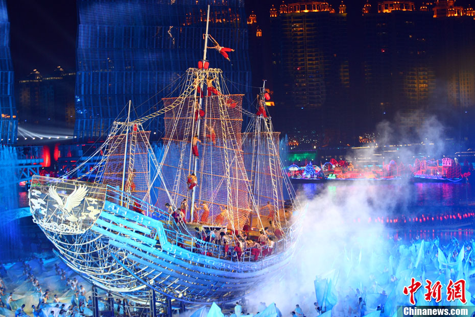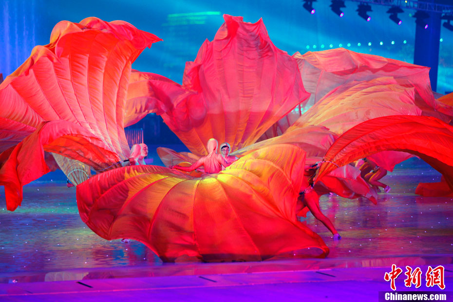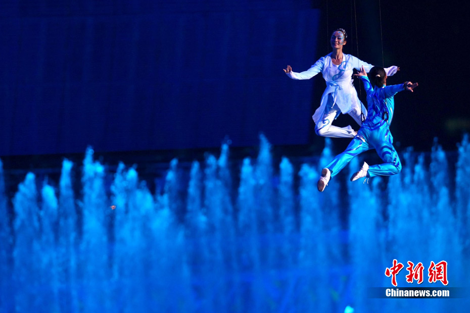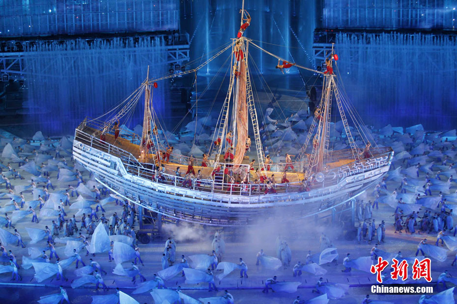 11月12日晚,第16届亚运会开幕式在广州海心沙举行,宏大、绚丽的文艺汇演《启航》给亚洲以及世界观众带来艺术盛宴。水是广州亚运开幕式最主要的创意元素,幕式的表演从一滴水到汪洋大海,从一叶扁舟到巨型帆船,从一汪情水到滔天巨浪。演员们用各种表演手段尽情展现水的魅力,表达水是生命之源、滋养万物、呵护人类文明的精神内涵,令人叹为观止。中新社记者 杜洋 摄