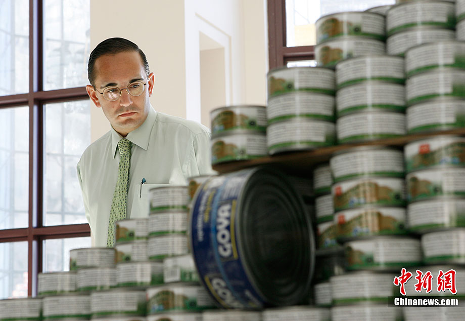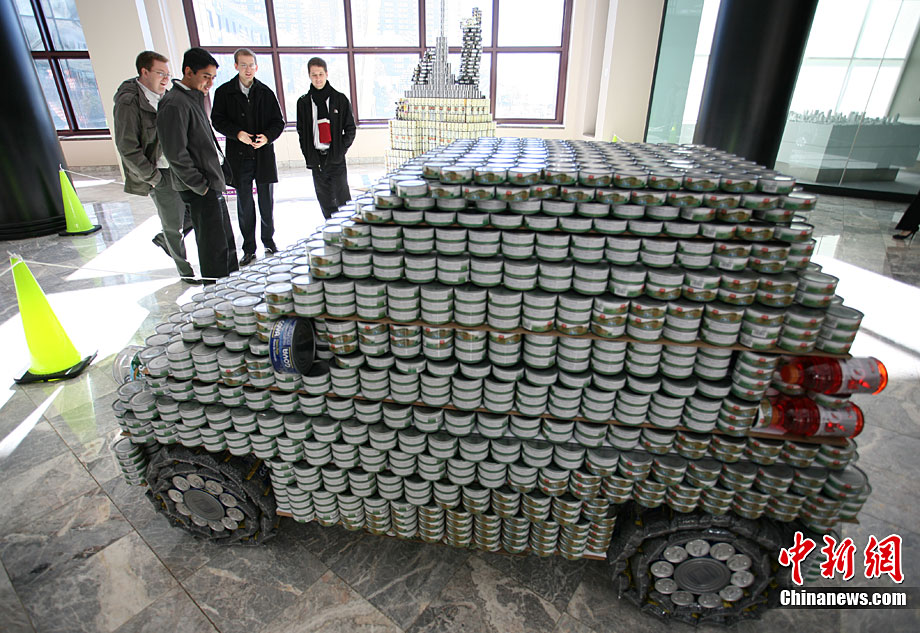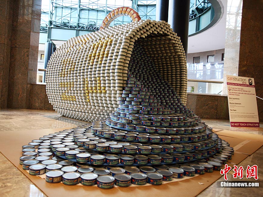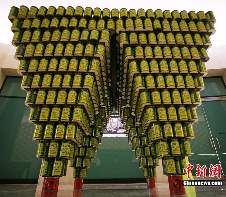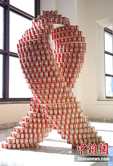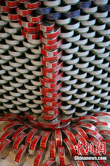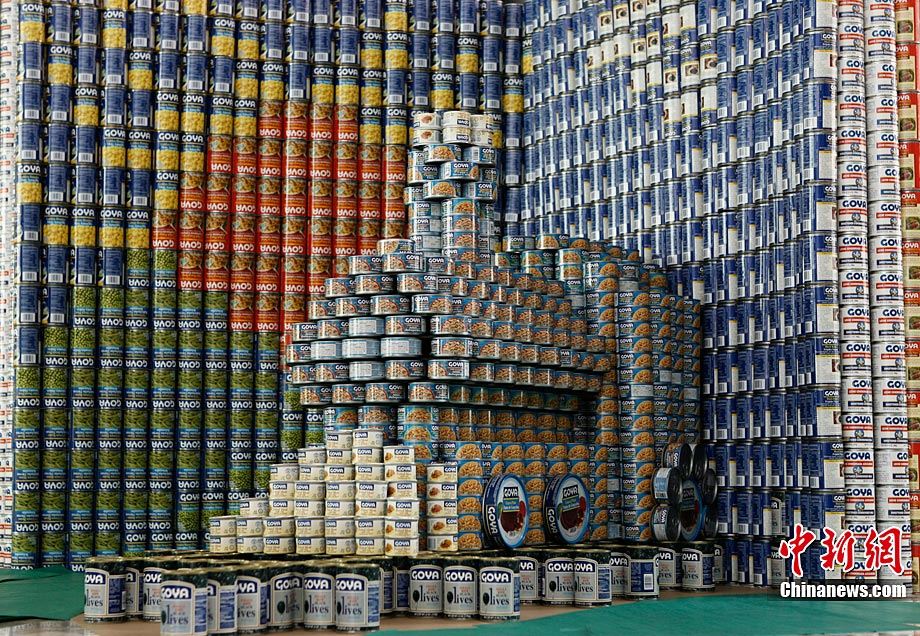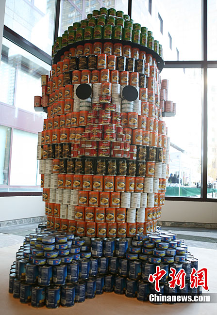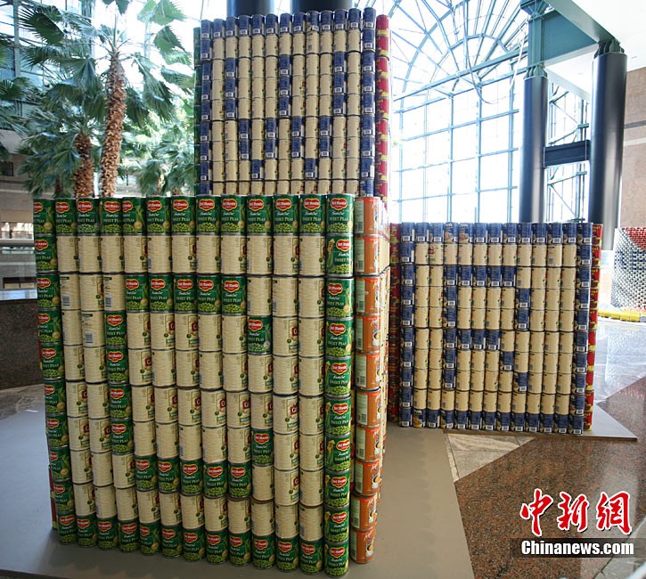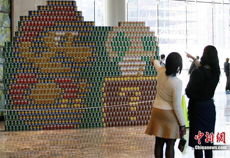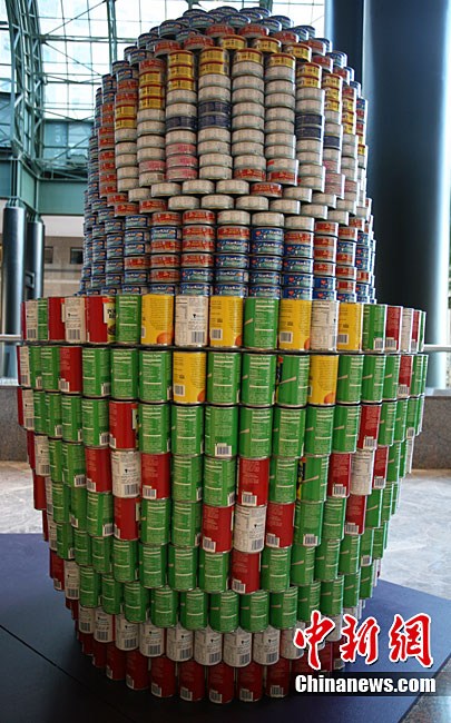 当地时间11月11日,美国纽约世界金融中心的冬园展出了一组用各种食品罐头组合成的雕塑作品。此次展览结束后,这些作品将被拆除,所有的罐头都将被捐给慈善机构“城市收获”,用来援助仍在忍受饥饿的人。