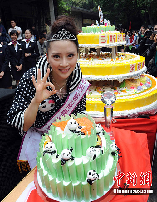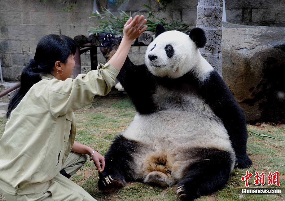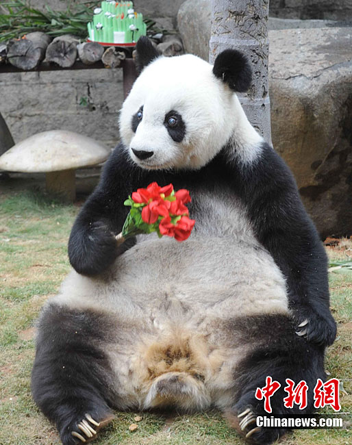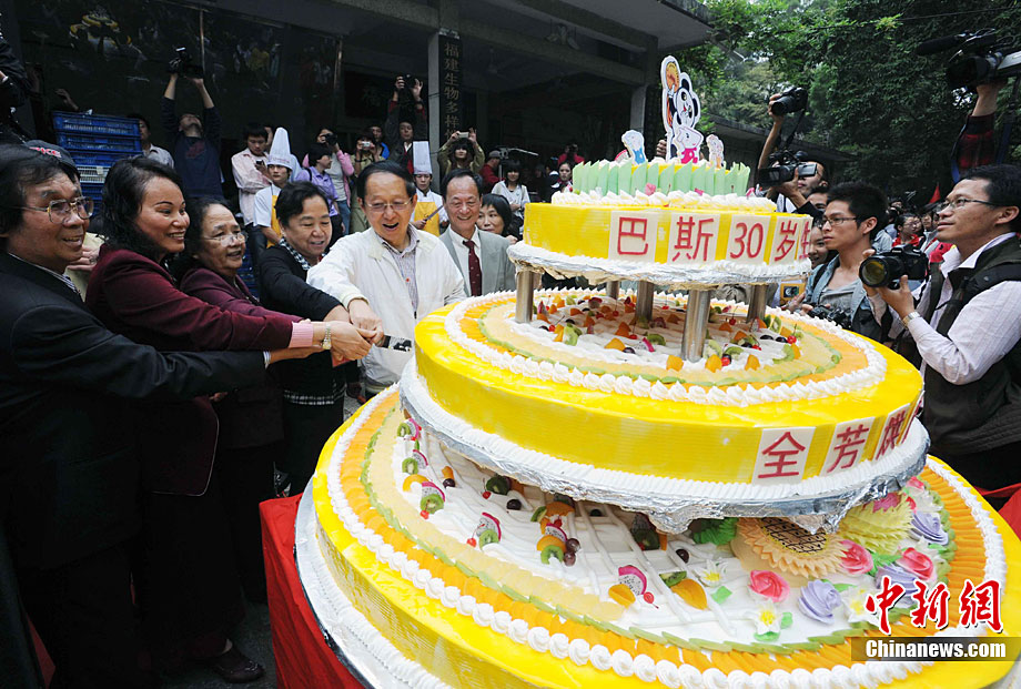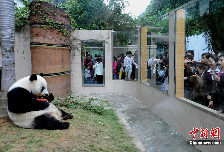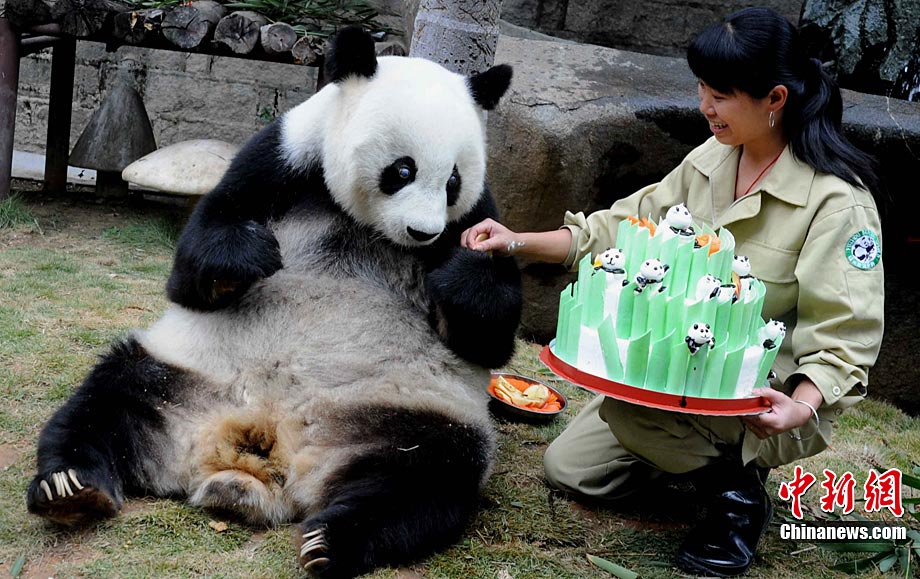 11月13日,福州熊猫世界、福州大熊猫研究中心在福州为闻名海内外的1990年北京亚运会吉祥物“盼盼”的原型——大熊猫明星“巴斯”举办隆重的30岁(相当于人类一百多岁)生日庆典系列活动,来自海内外三千多名各界人士参加该庆典活动。福州熊猫世界饲养员为欢度30岁生日(相当于人类一百多岁)的北京亚运会吉祥物“盼盼”的原型——大熊猫明星“巴斯”送上专门制作的生日蛋糕。中新社记者 刘可耕 摄