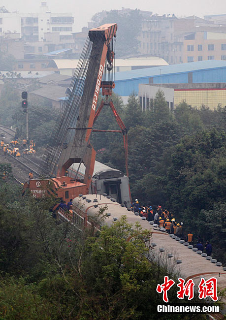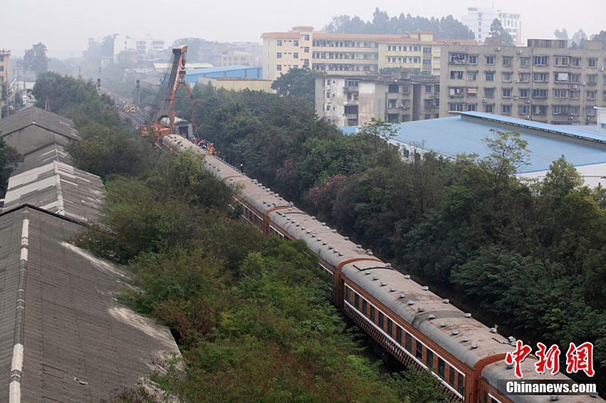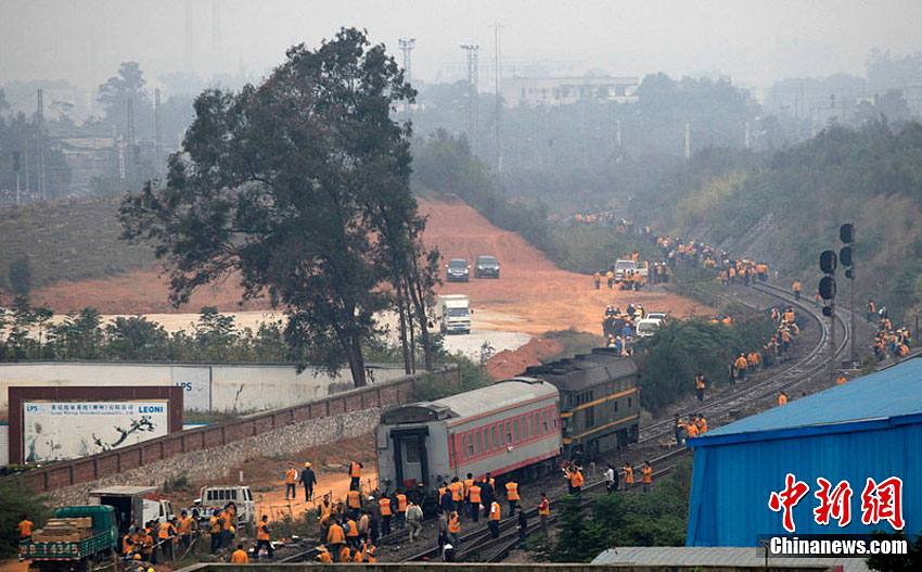 11月15日凌晨3时许,由北京开往湛江的k157次旅客列车在湘桂线柳南到达场脱轨,事故造成1节车厢脱轨,无人员伤亡,不影响行车。据介绍,脱轨车辆为机后第五位车厢,目前救援工作已经结束,旅客已安全转移,列车重新编组后继续开行。事故原因正在调查中。图为15日8时许,列车回归正常轨道并离开事故现场。图片来源:CFP视觉中国