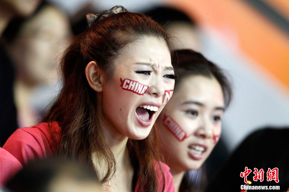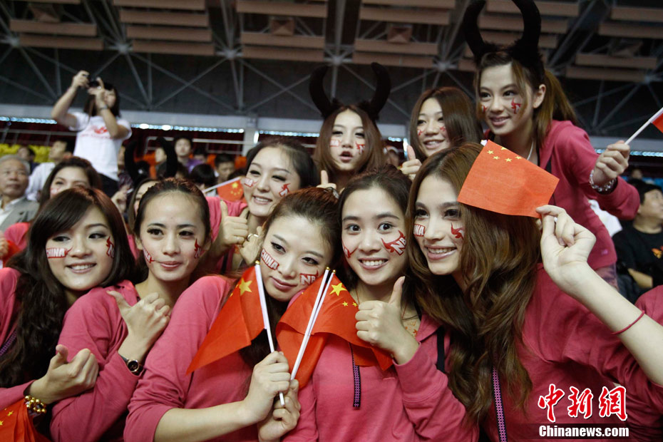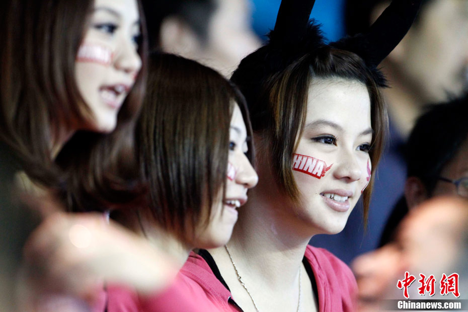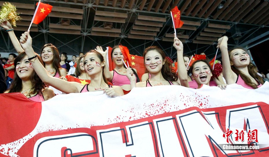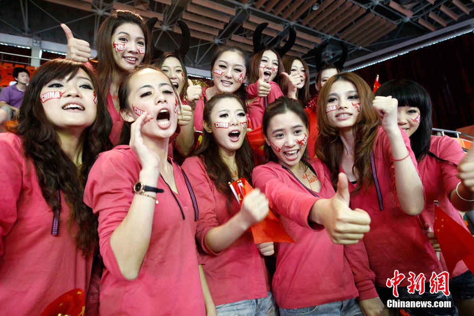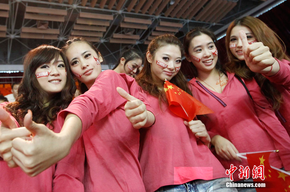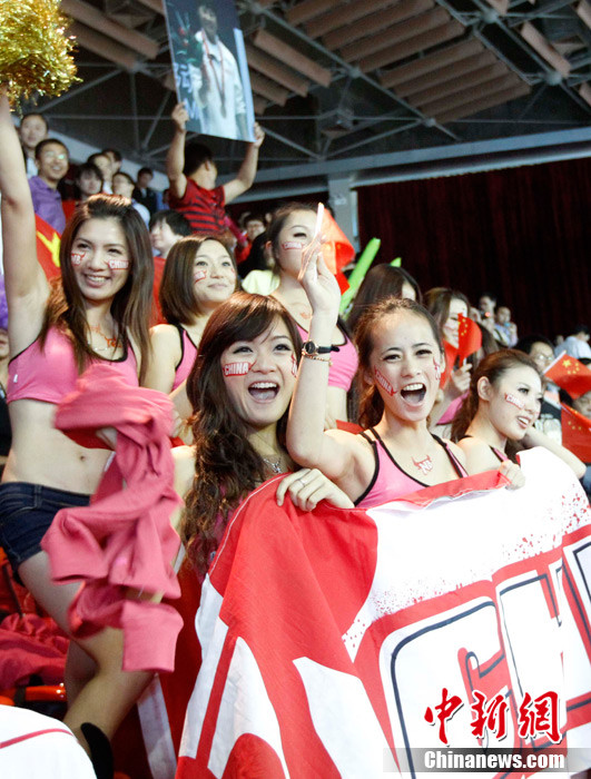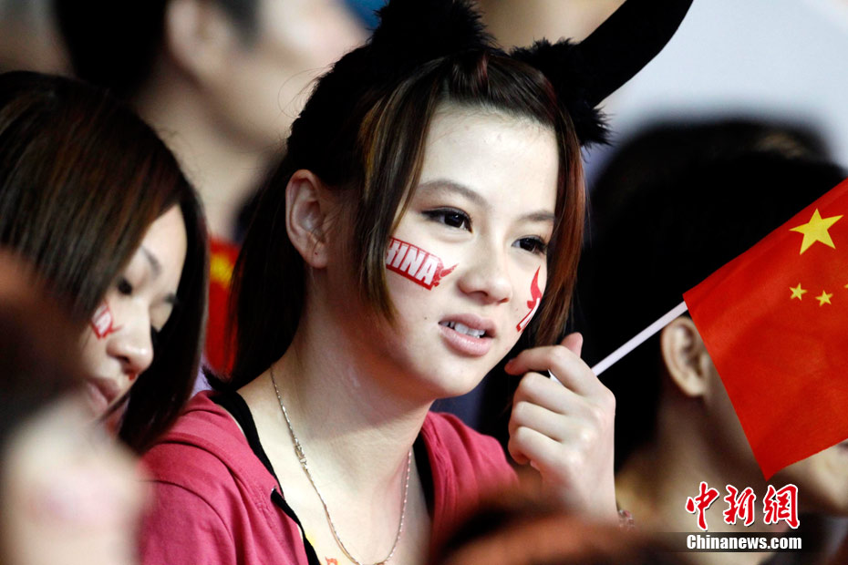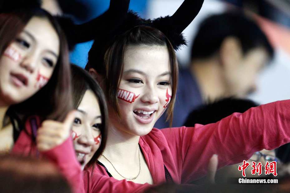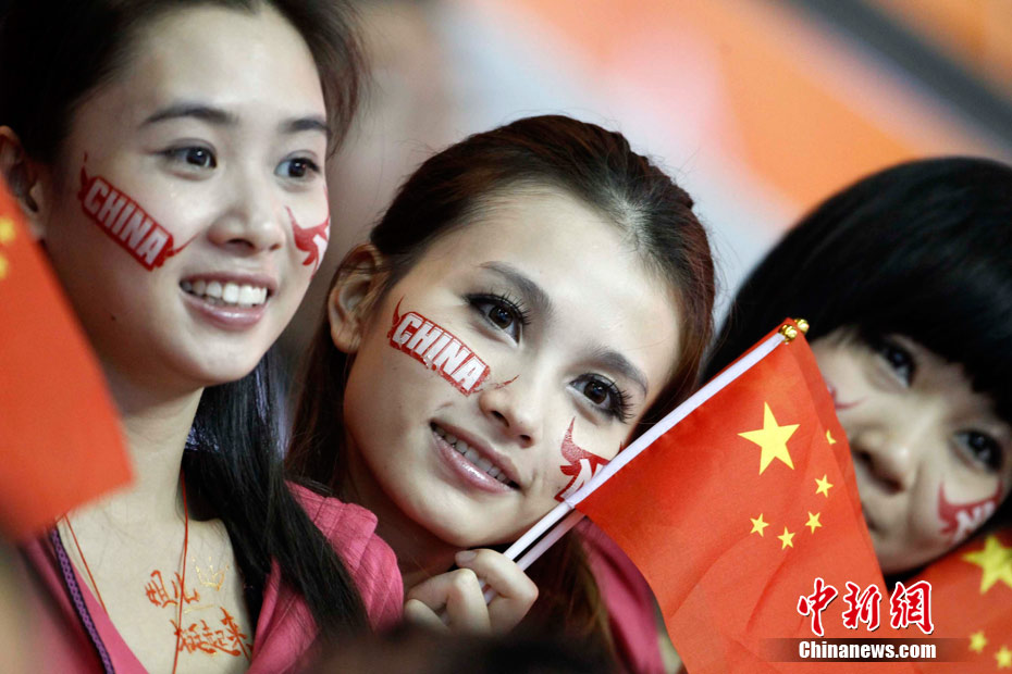 11月15日,广州亚运会举重比赛继续在东莞举行,看台上一群美少女观众令赛场气氛更为火爆。中新社记者 杜洋 摄