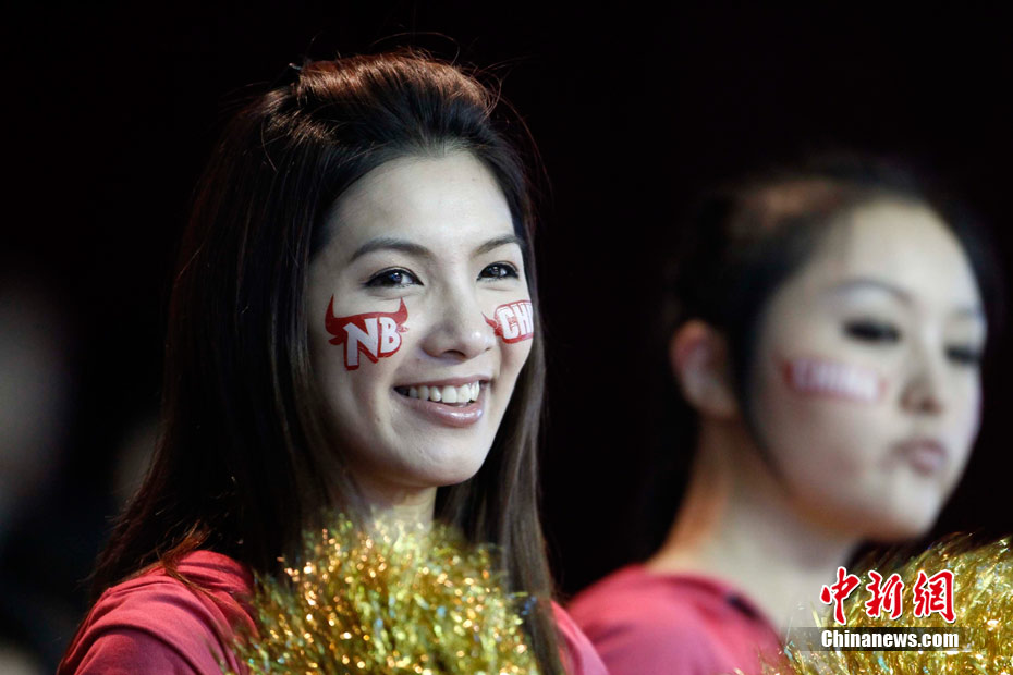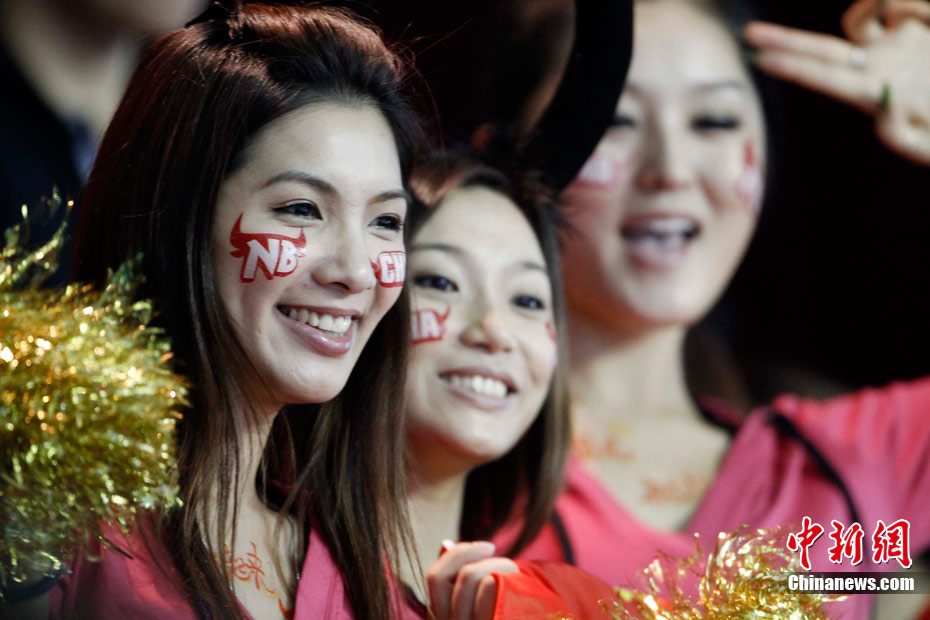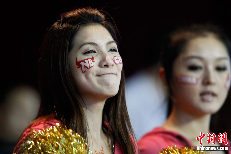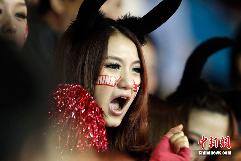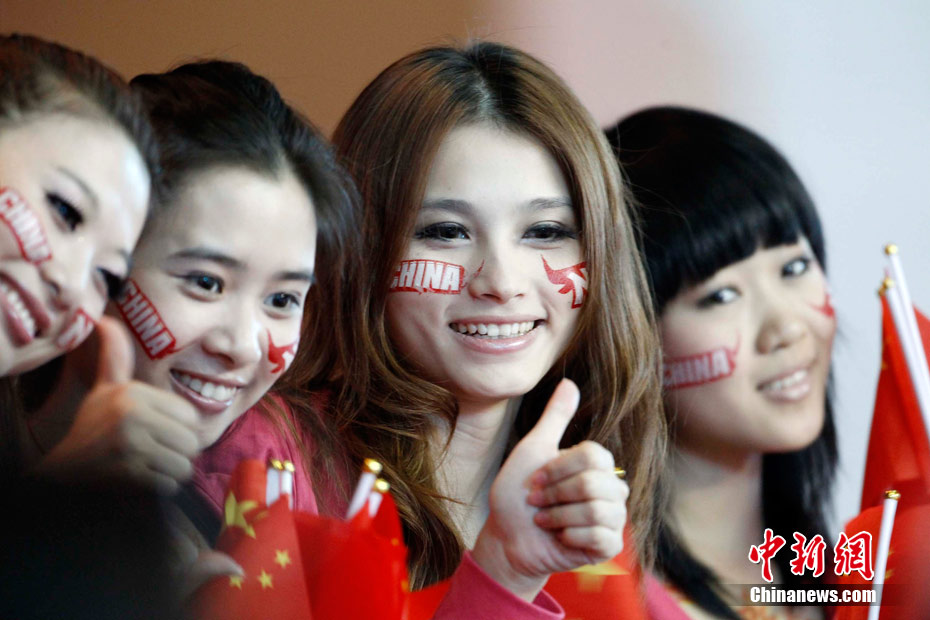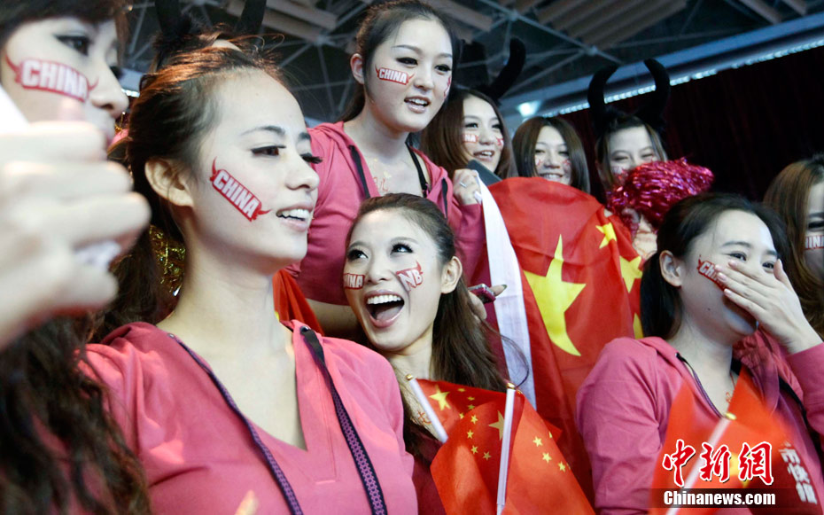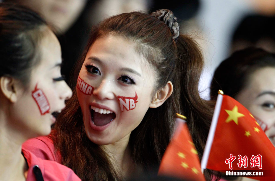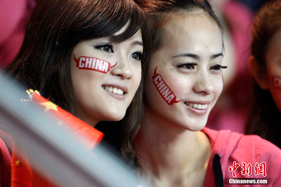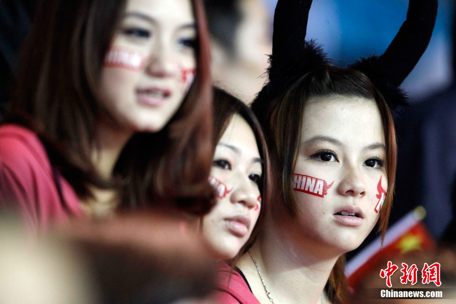 11月15日,广州亚运会举重比赛继续在东莞举行,看台上一群美少女观众令赛场气氛更为火爆。中新社记者 杜洋 摄