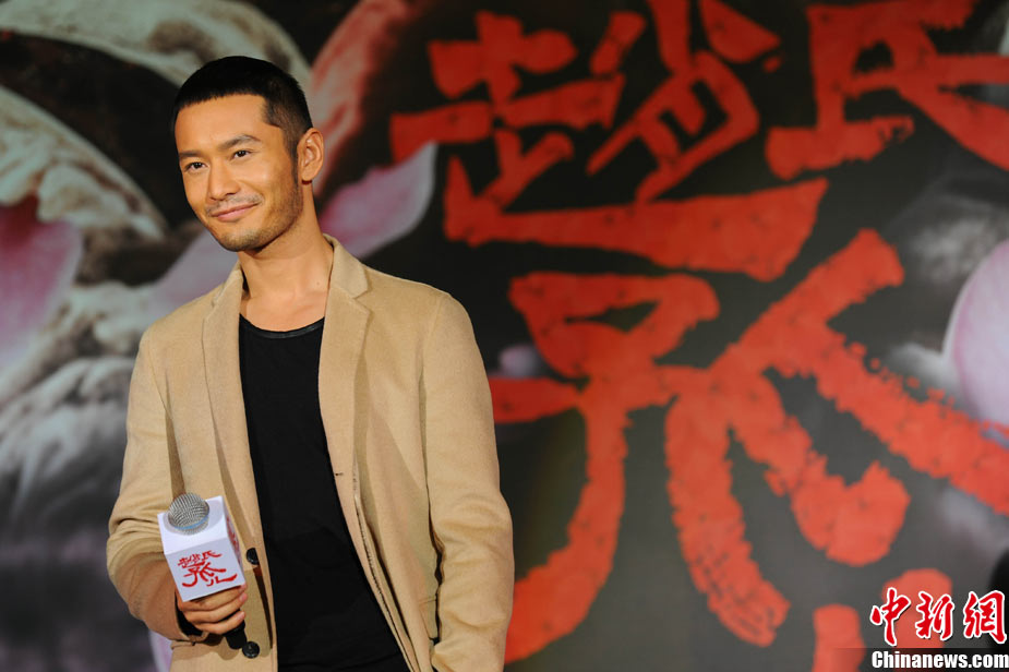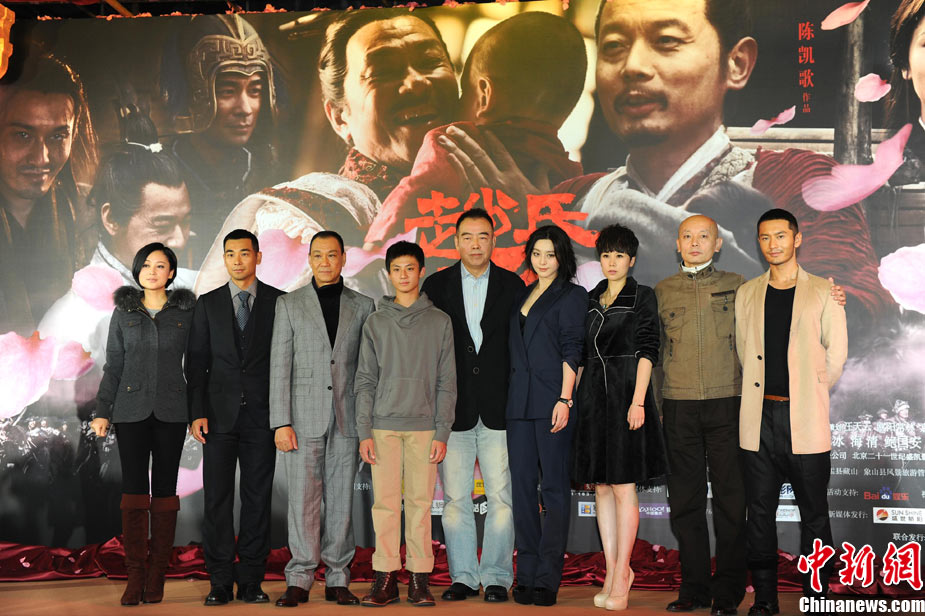 11月15日,贺岁档大片《赵氏孤儿》群星闪耀媒体见面会在北京盛大举办。导演陈凯歌携主演葛优、王学圻、黄晓明、范冰冰、赵文卓、海清、赵文浩出席。葛优、王学圻饰演的程婴和屠岸贾在片中有诸多较量,此前传闻两位大腕暗自使劲、互相飚戏。为了打破传言,现场葛优、王学圻上演“亲密熊抱”,王学圻出人意料的“背摔”让葛优险些摔倒在地。现场气氛热烈,笑声不断。中新社记者 李学仕 摄