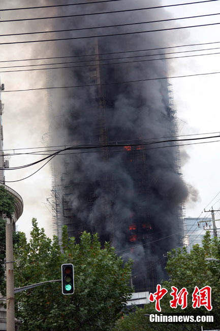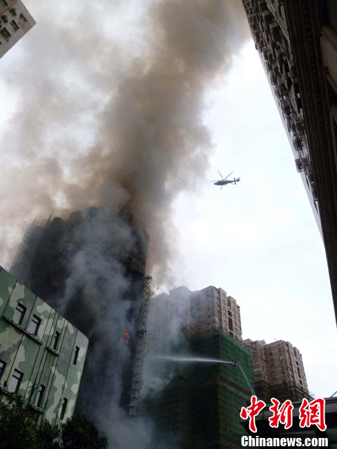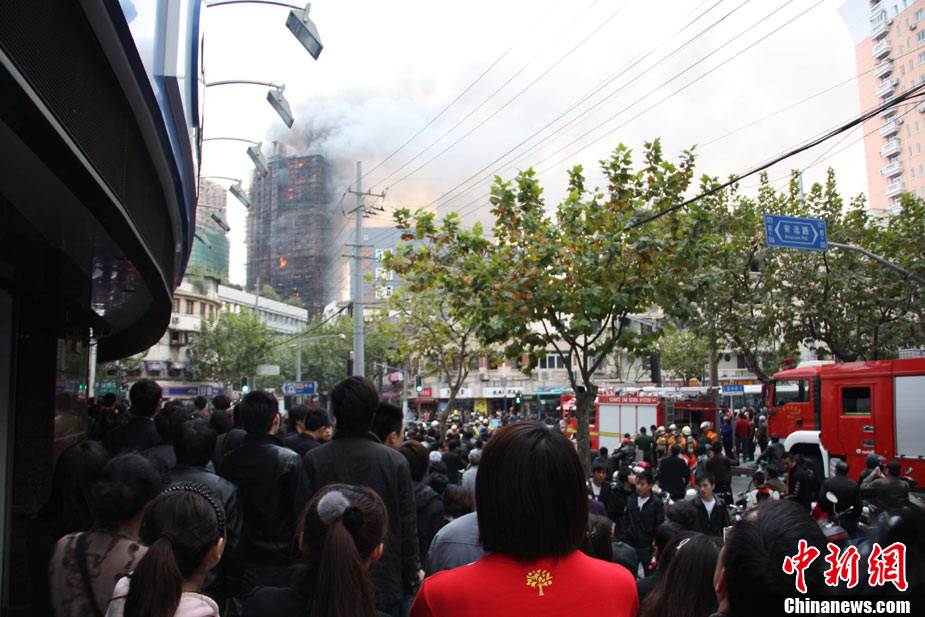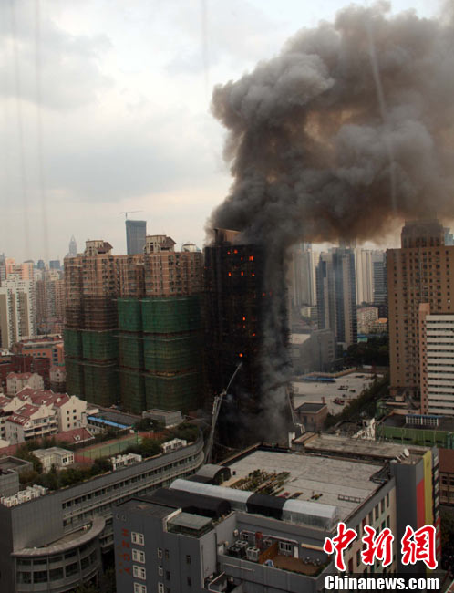 11月15日下午2时15分,上海中心城区静安区正在进行外墙装修的教师公寓的脚手架起火,火警发生后,公安民警、消防队员迅速赶往现场救援,到场消防车超过10辆。起火原因和损失状况正在进一步调查中。中新社发 张嘉森 摄