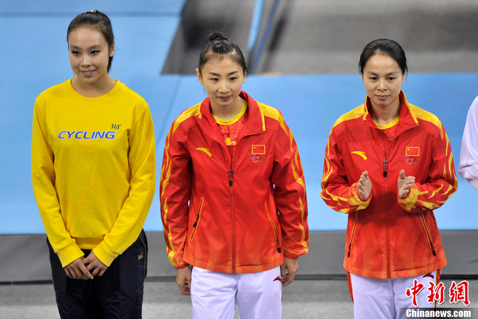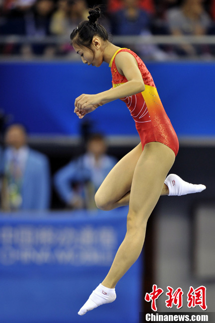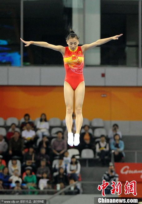 11月21日上午,广州亚运会蹦床个人资格赛在亚运城体育馆上演,中国女子选手何雯娜、黄珊汕;男子选手选手董栋、涂潇全部顺利晋级决赛。图为何雯娜亮相亚运城体育馆。中新网记者 金硕 摄