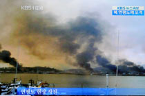 当地时间23日下午2时34分许,朝鲜向韩国一侧的延坪岛附近发射海岸炮炮弹,其中数枚落在有居民居住的岛上,导致数十栋建筑起火或受损。图为韩国电视台的画面截图。