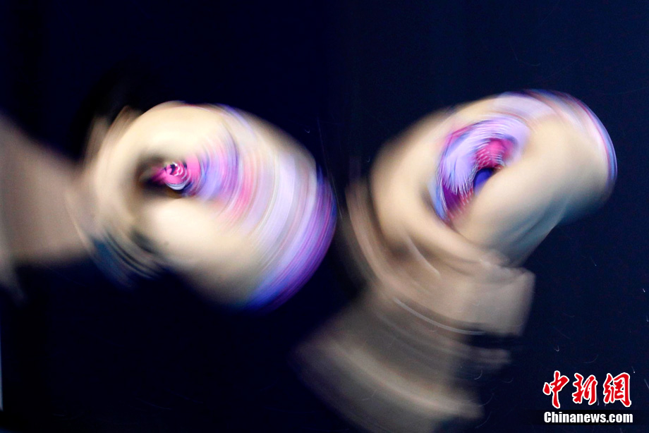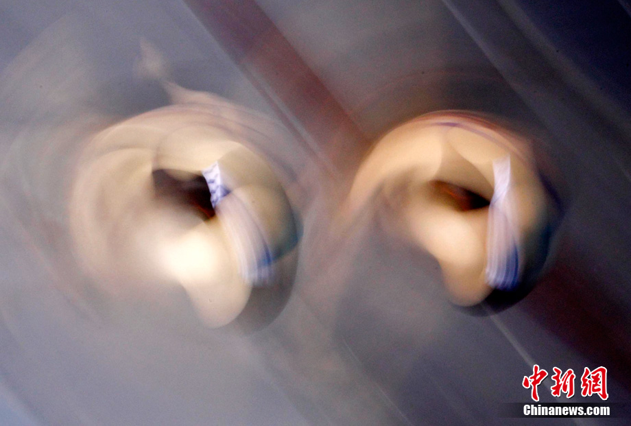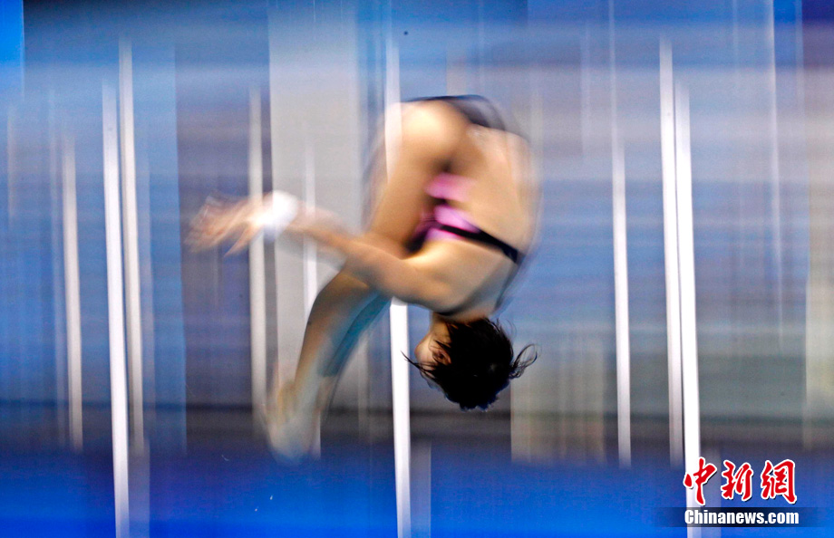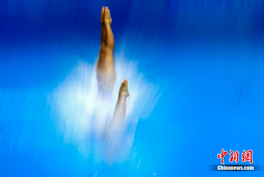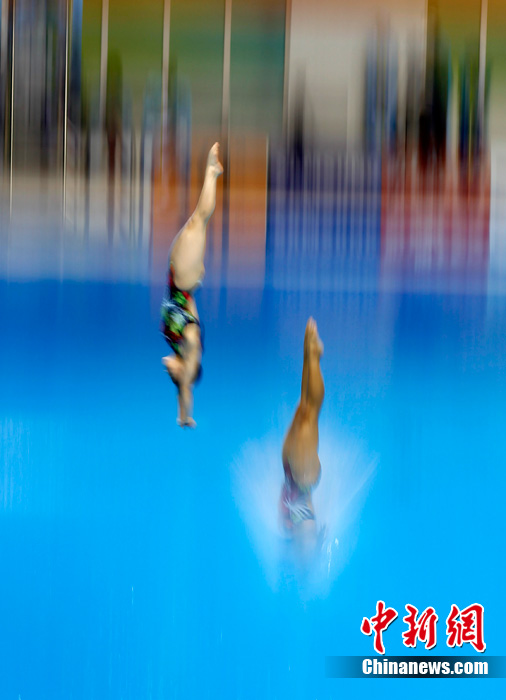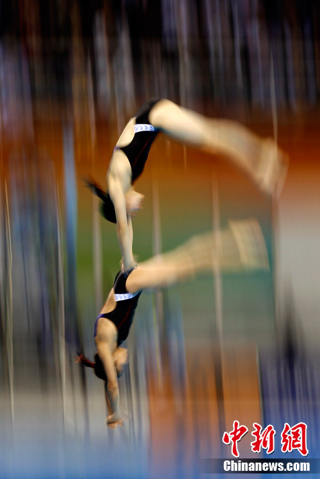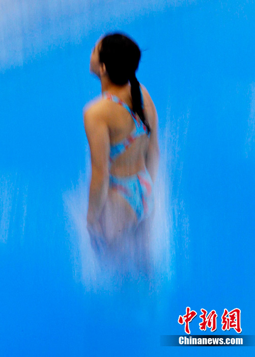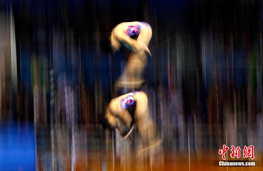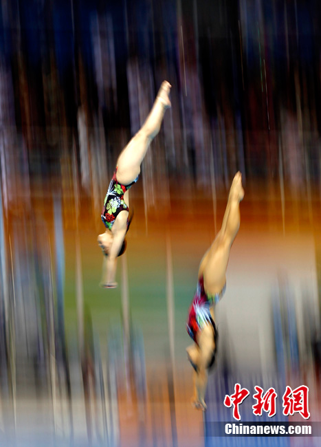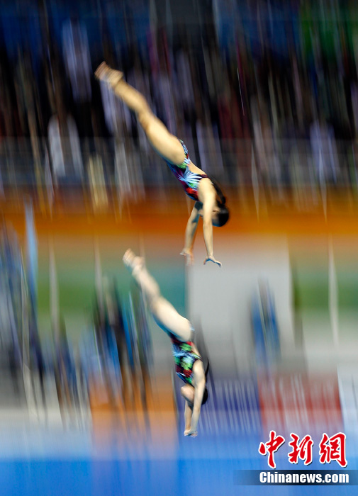 11月23日,广州亚运会女子双人10米跳台赛场的精彩瞬间。中新社记者 盛佳鹏 摄