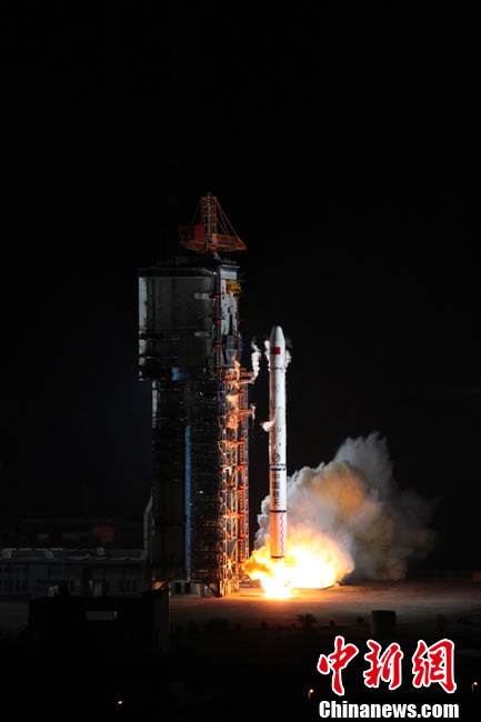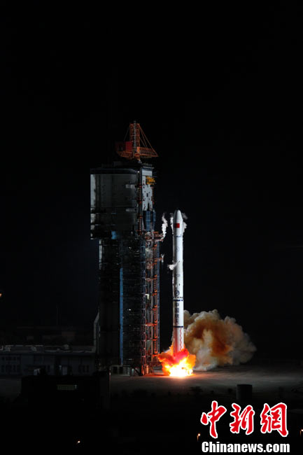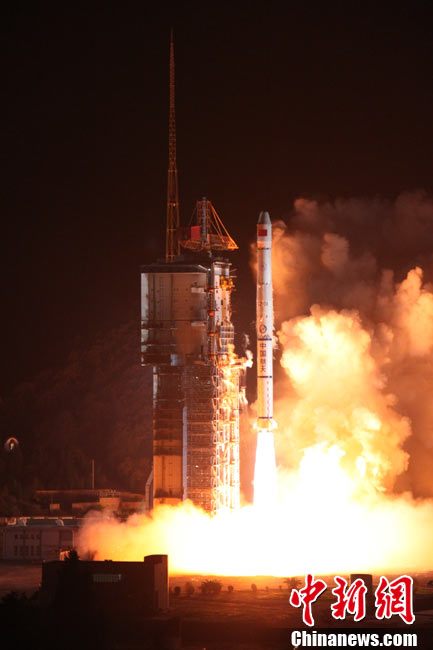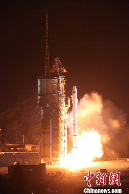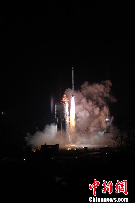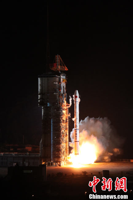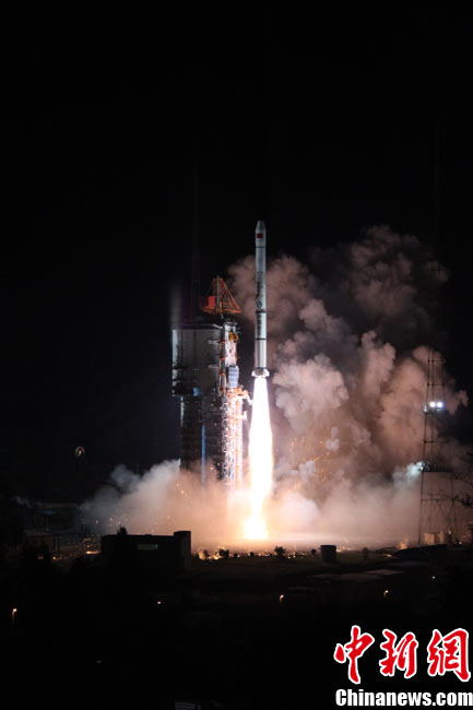 北京时间25日0时9分,中国在西昌卫星发射中心用“长征三号甲”运载火箭,将“中星-20A”通信广播卫星成功送入太空预定轨道。中新网发 王玉磊 摄