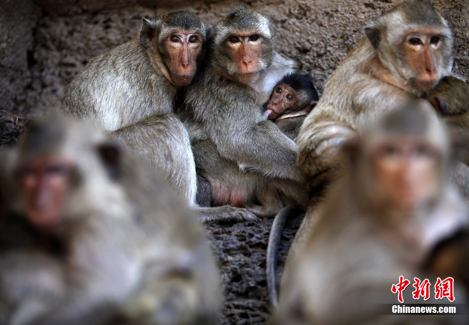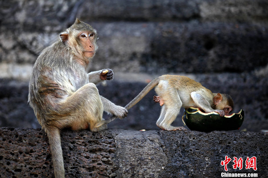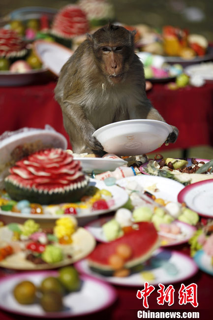 泰国举办猴子“宴会” 猴子餐桌大快朵颐