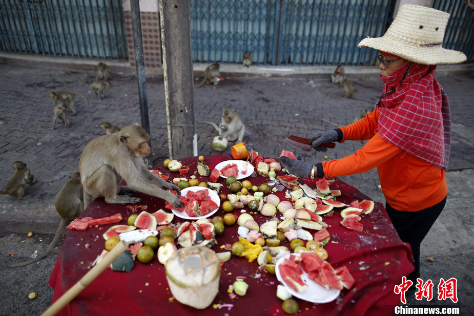 11月28日,泰国华富里,一年一度的“猴子的宴会”活动在当地举行。猴子们可以尽情享用超过4000公斤的水果和蔬菜。华富里以猴子众多闻名,猴子们每年都为当地吸引来大量观光客。