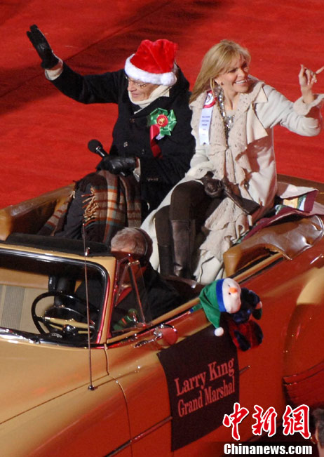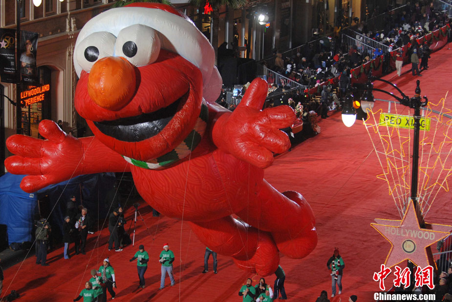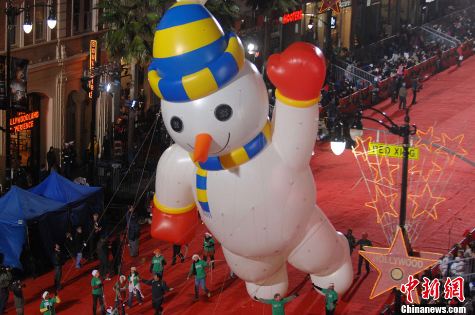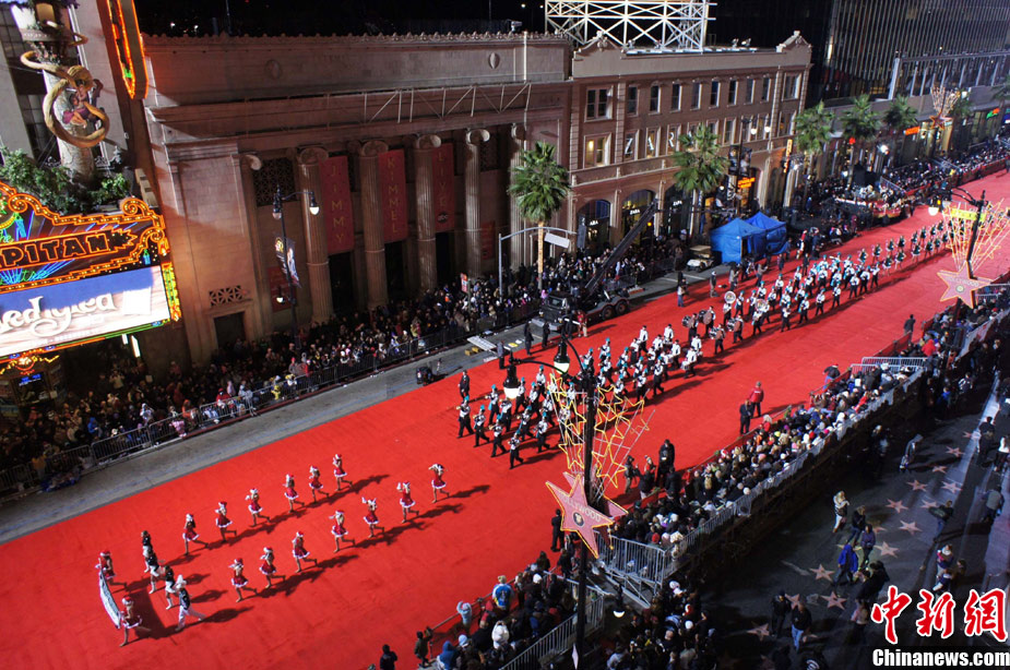 11月28日晚,一年一度的好莱坞迎圣诞大游行在好莱坞大道隆重举行。CNN王牌主播拉里·金担任今年游行的大礼官,在他的率领下,近60名好莱坞明星和14个乐队、8个骑马方阵、巨型充气卡通、花车等游行队伍依次通过红地毯,为洛杉矶迎圣诞活动拉开大幕。好莱坞迎圣诞大游行始于1928年,至今已有80多年历史。中新社发 张炜 摄