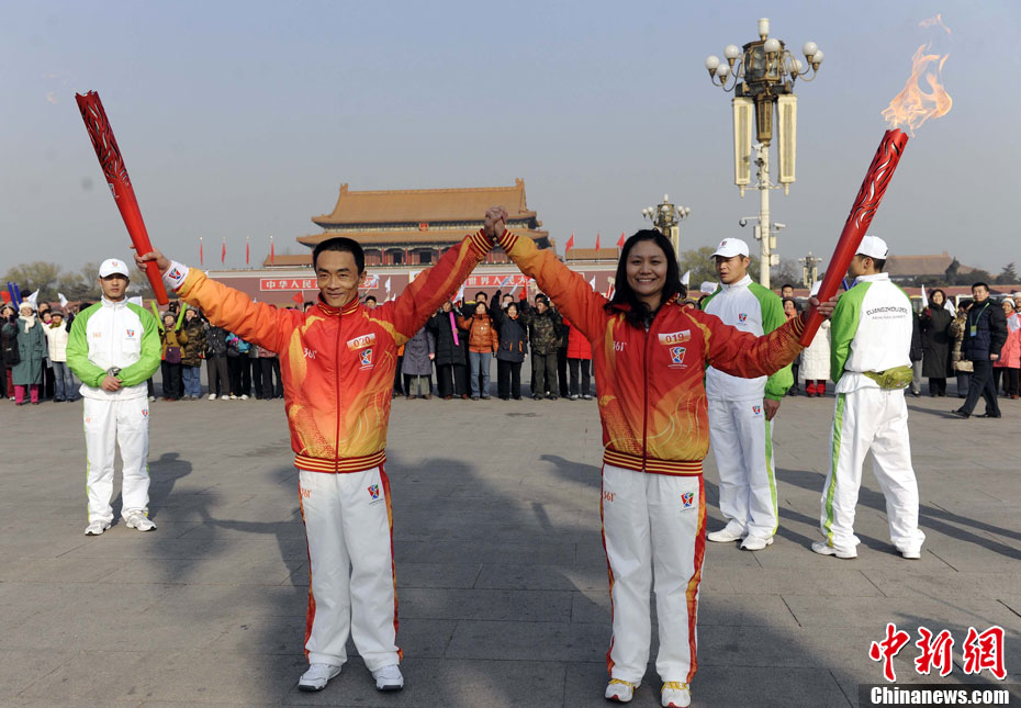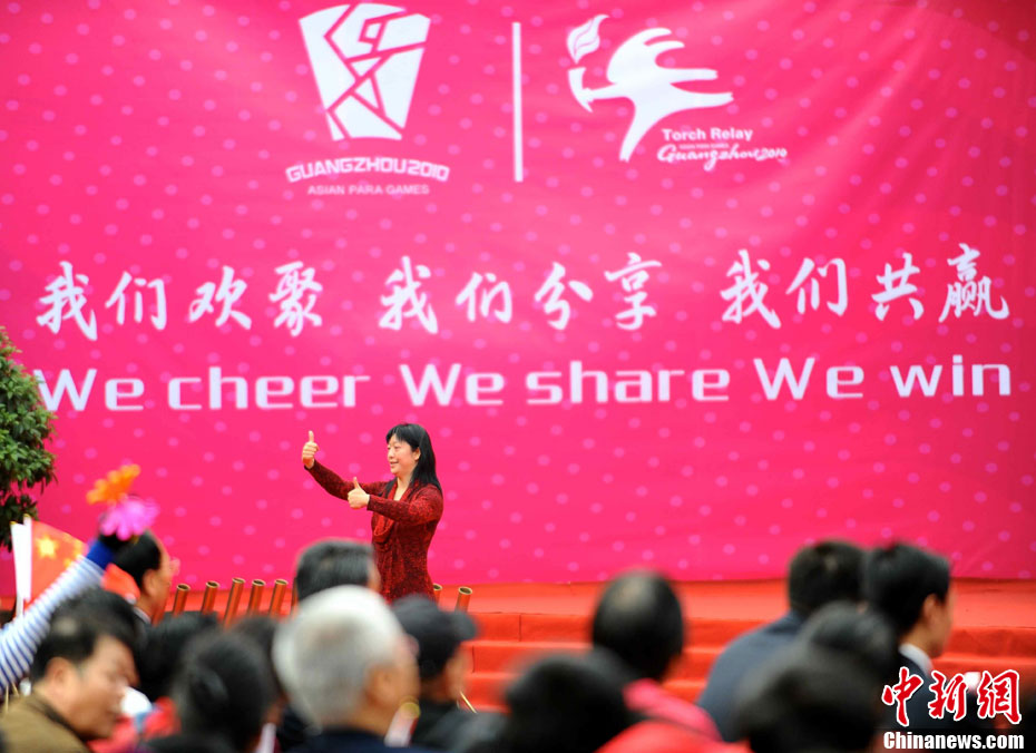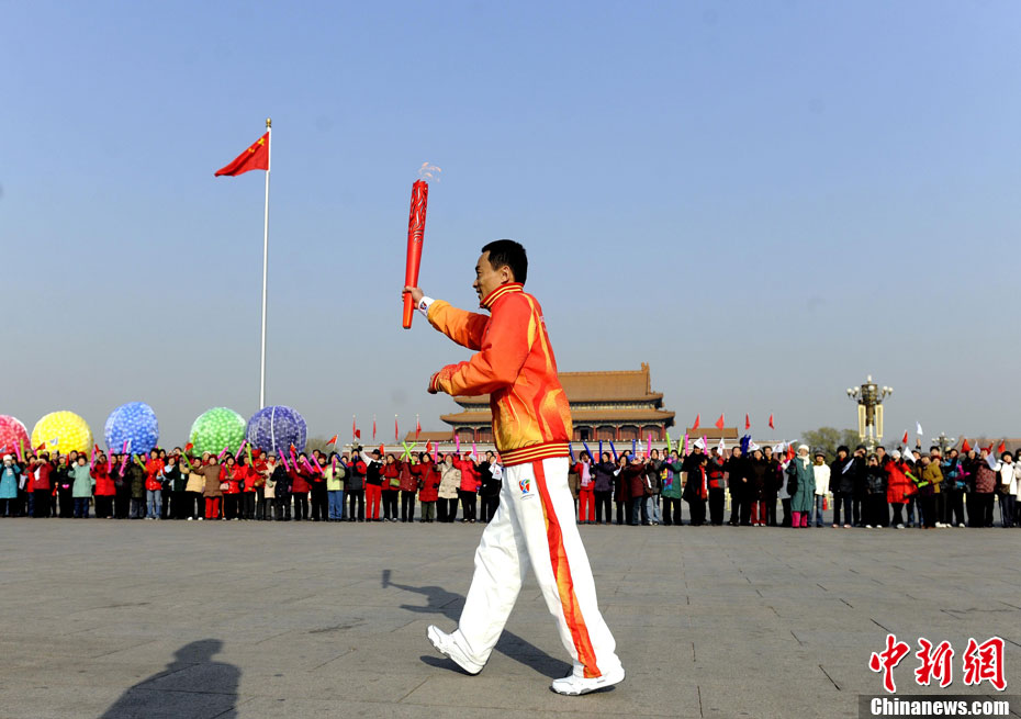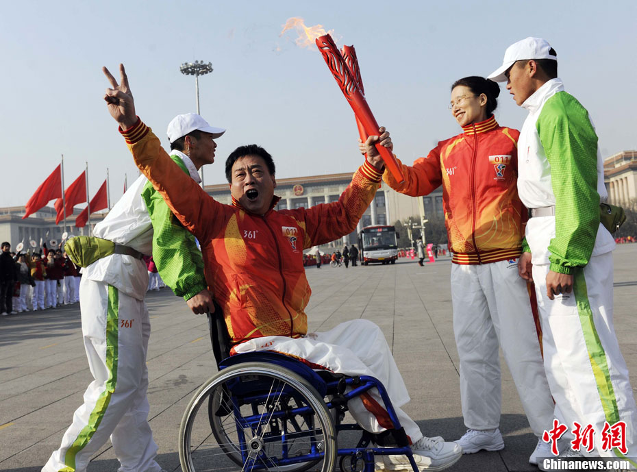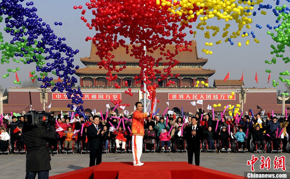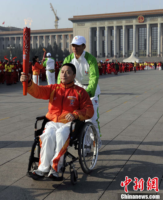 12月4日10时整,广州2010年亚洲残疾人运动会火炬点燃暨火炬传递活动在北京人民大会堂北大厅启动。北京站传递活动有20棒火炬手,整个火炬传递活动围绕天安门广场北广场进行。中新社记者 刘震 摄