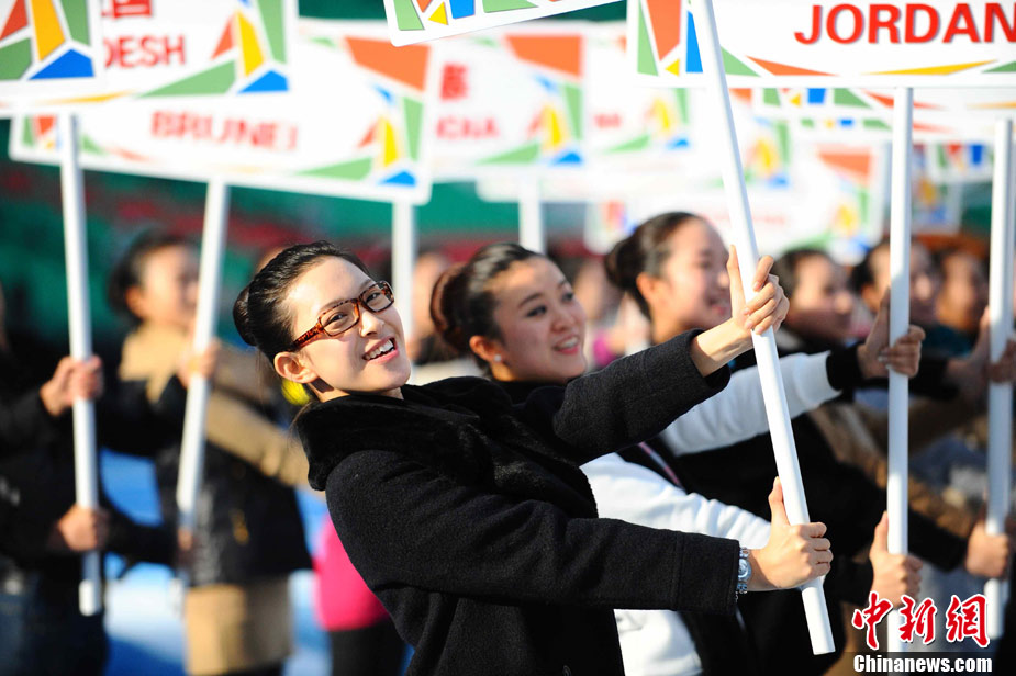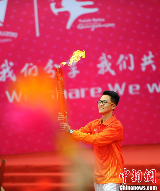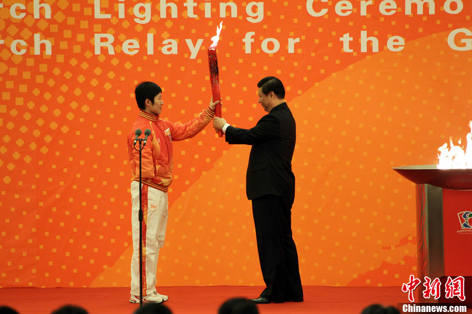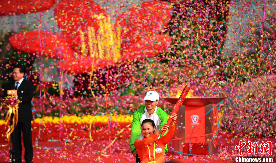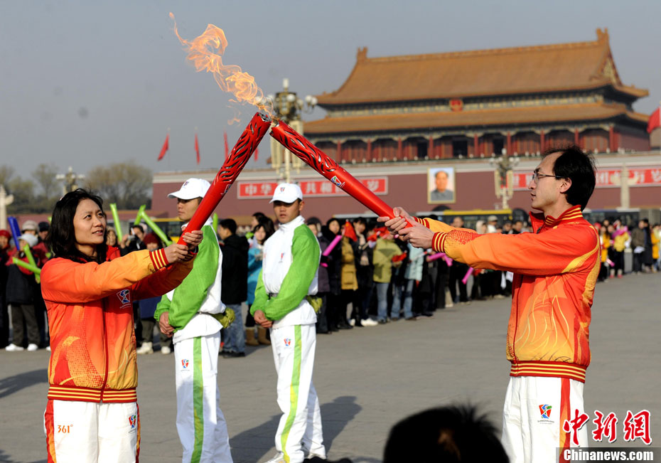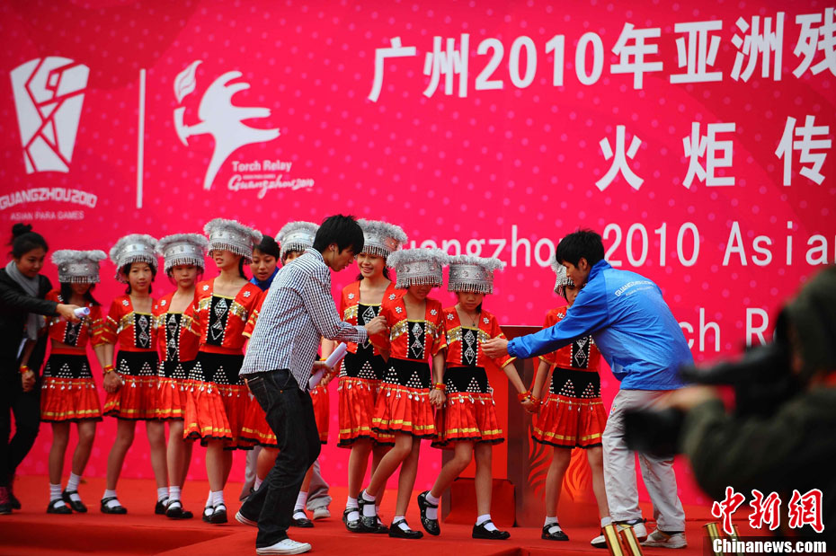 12月4日10时整,广州2010年亚洲残疾人运动会火炬点燃暨火炬传递活动在北京人民大会堂北大厅启动。北京站传递活动有20棒火炬手,整个火炬传递活动围绕天安门广场北广场进行。中新社记者 刘震 摄