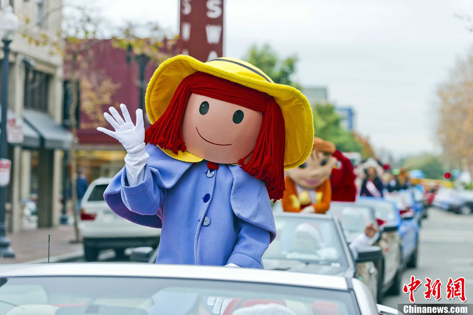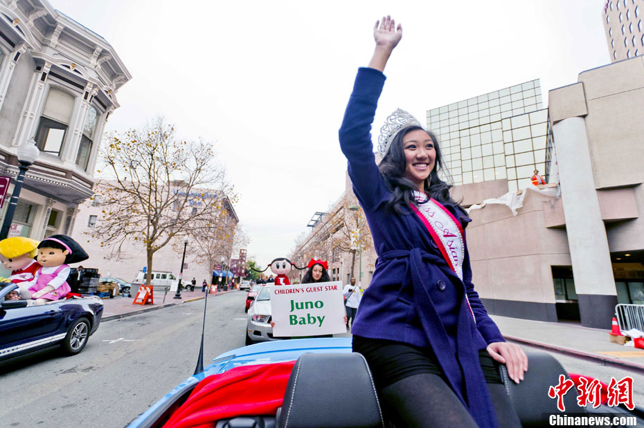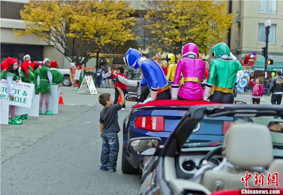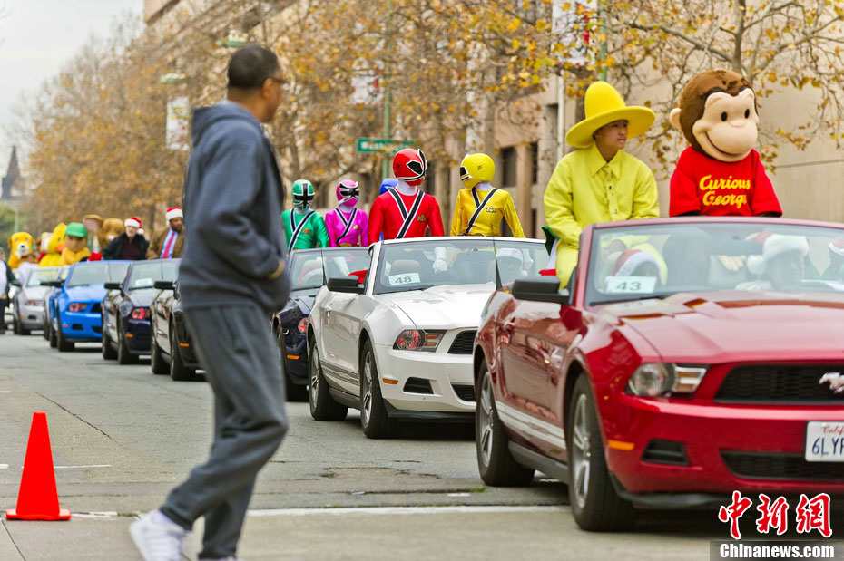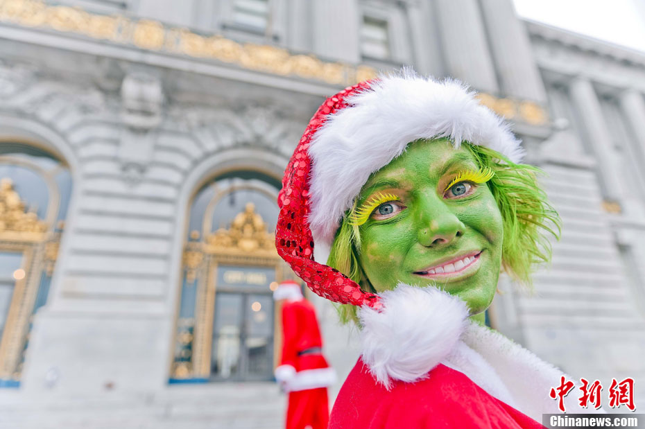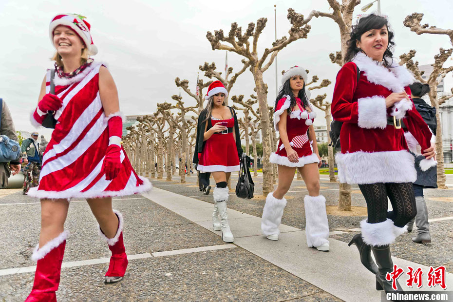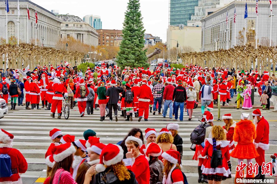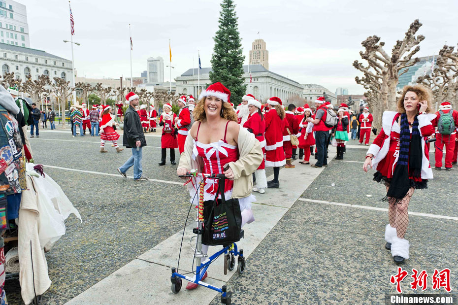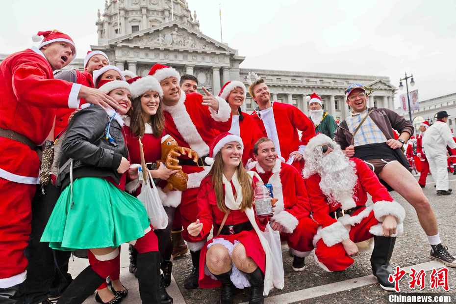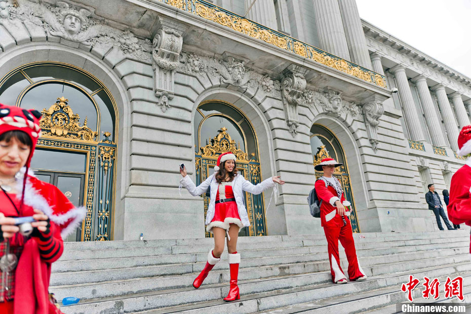 当地时间12月4日下午,千余名装扮成圣诞老人的男男女女聚集在美国旧金山市政府广场前,以歌舞形式迎接圣诞佳节。图为情侣们的开心一刻。中新社发 陈钢 摄