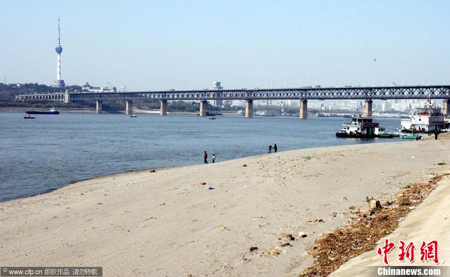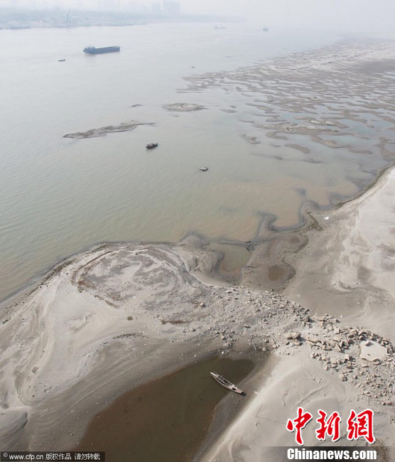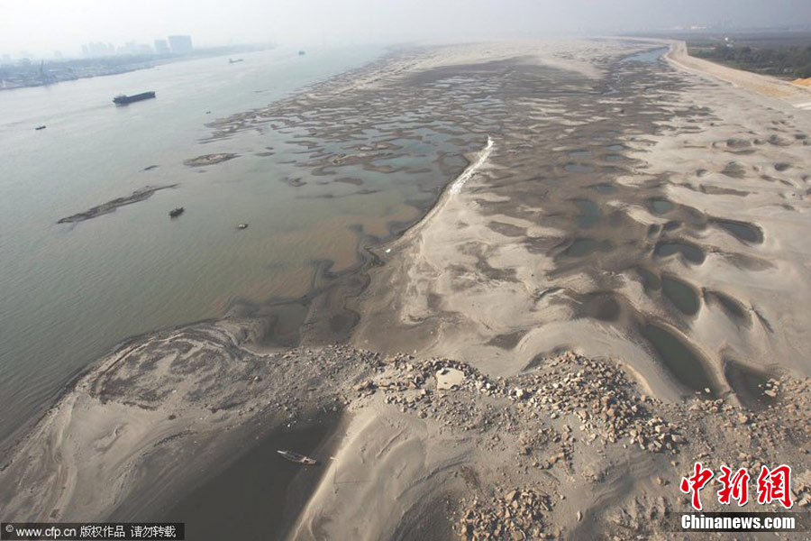 12月7日,在长江武汉市天兴洲水域,大量沙洲露出江面,形成大大小小的沙丘,分布在水岸。据悉,近期,由于长江中下游地区持续多日的干燥少雨的天气,长江汉口水位接近枯水期的标植。金思柳 摄 图片来源:CFP视觉中国