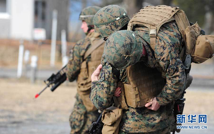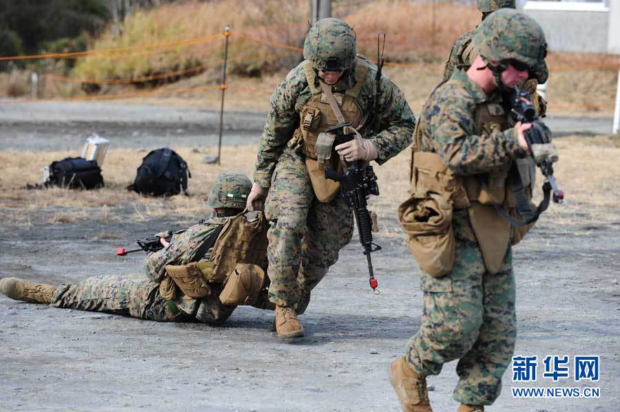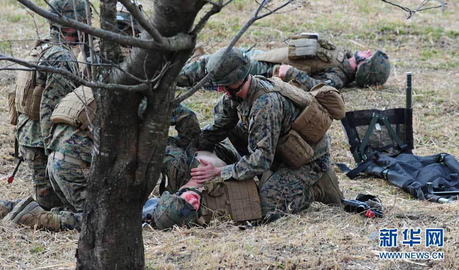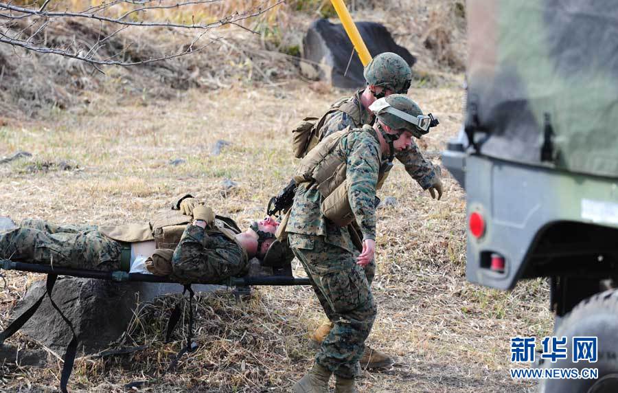12月7日,在位于日本宫崎县和鹿儿岛县交界处的雾岛演习场,参加演习的美国海军陆战队士兵在“救护”战斗中的“伤员”。