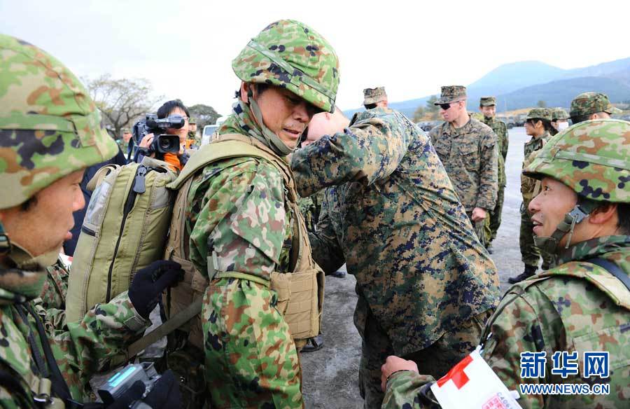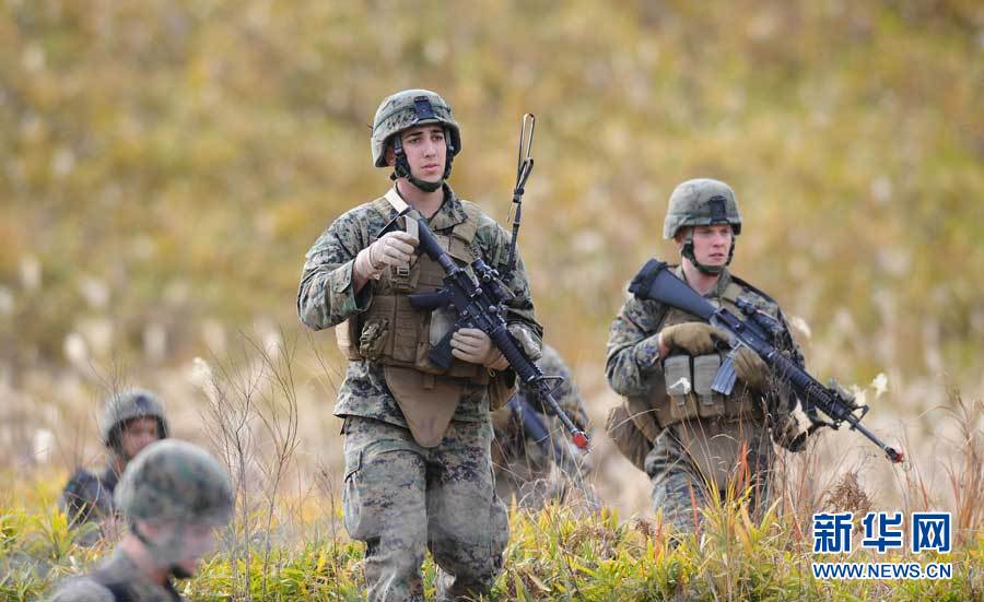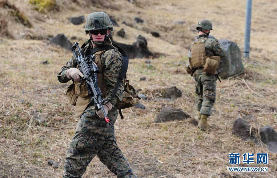 当日,日本陆上自卫队与美国海军陆战队在雾岛演习场举行地面战联合训练开始仪式。此次训练共有日本陆上自卫队550人、美国海军陆战队230人参加。季春鹏摄 图片来源:新华网