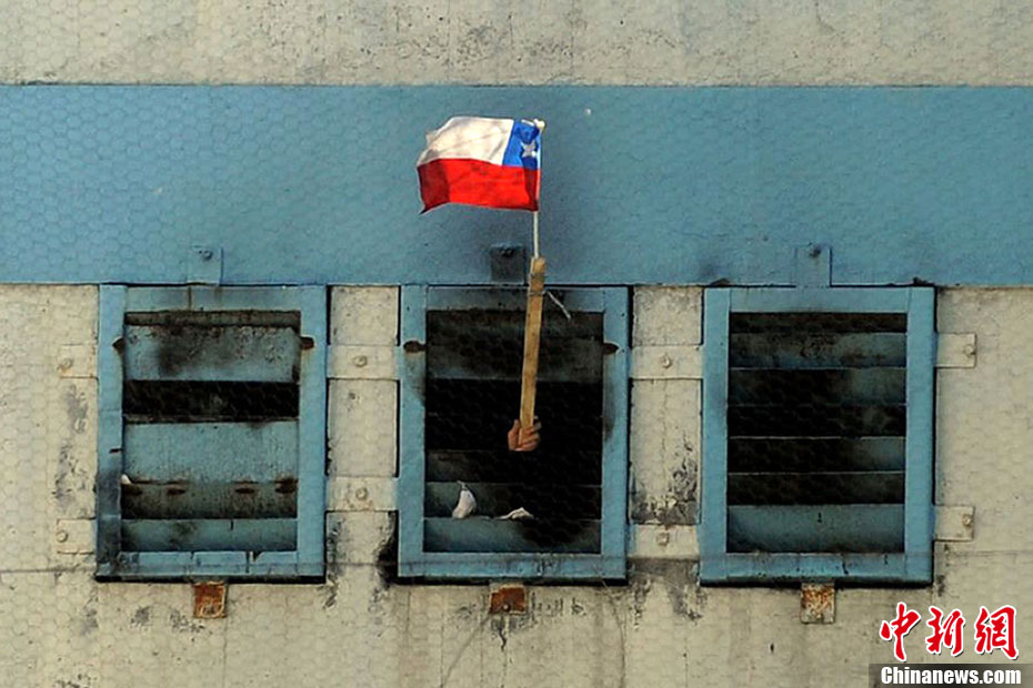 图为一名被困者从屋内伸出手挥舞智利国旗。据了解,死者多被火灾引发的浓烟呛死。