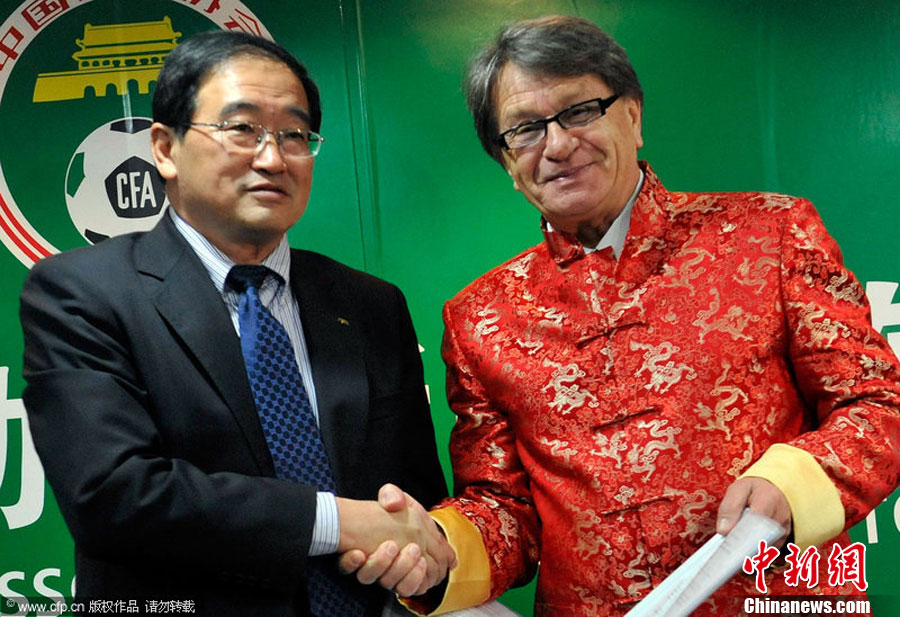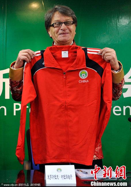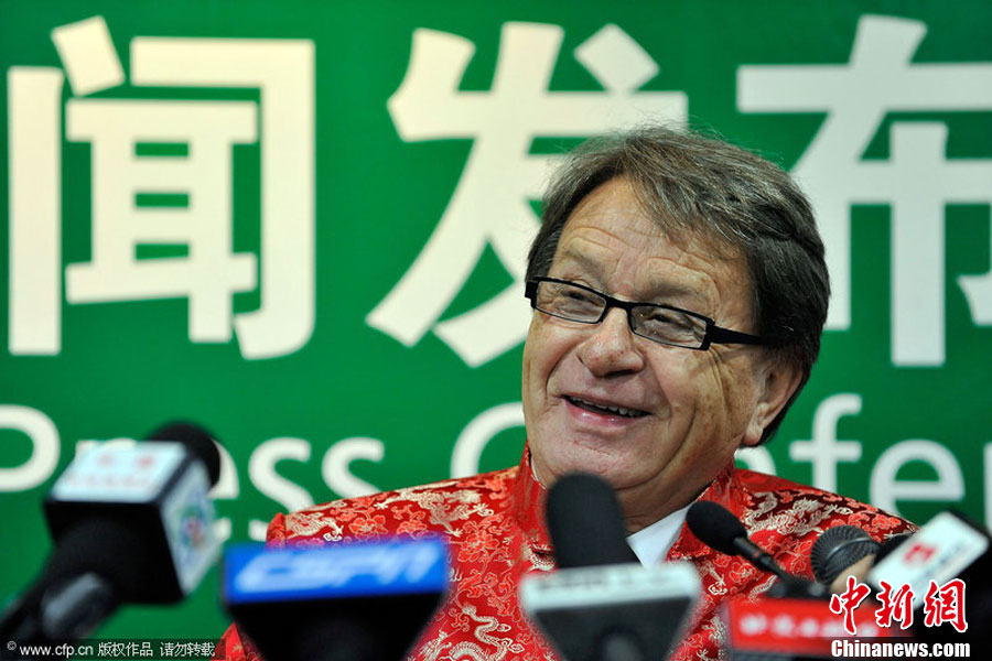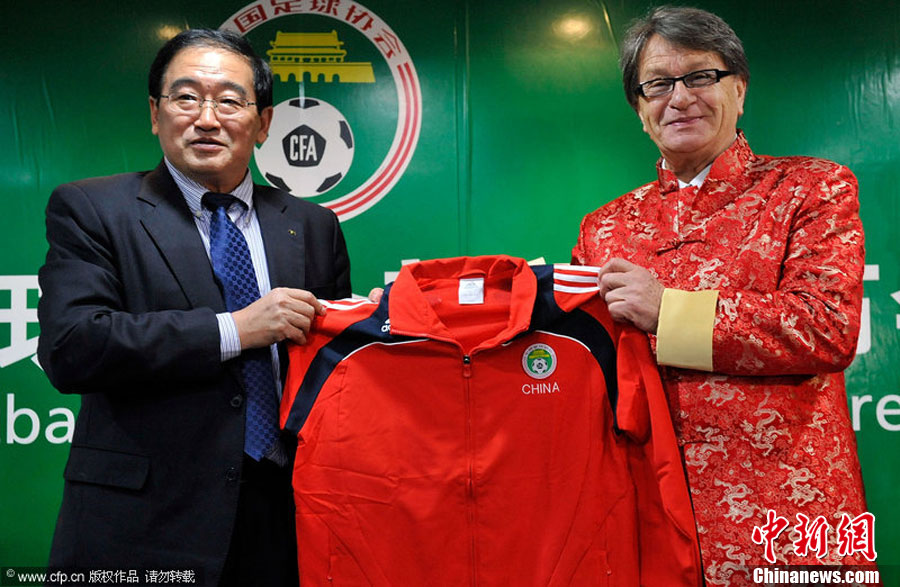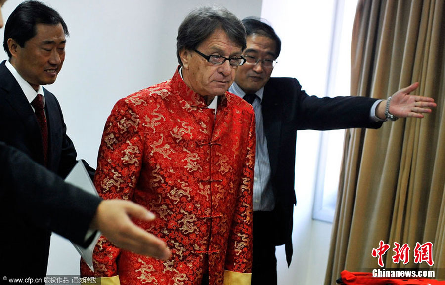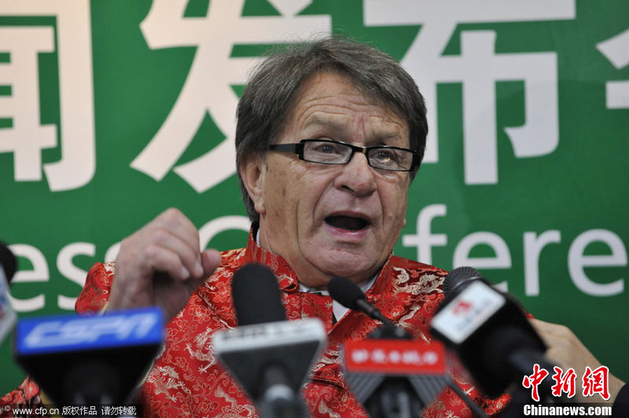12月11日,中国北京,中国足协召开新闻发布会,前上海申花主帅布拉泽维奇正式出任国奥主帅。图为布拉泽维奇着唐装出席发布会。图片来源:CFP视觉中国