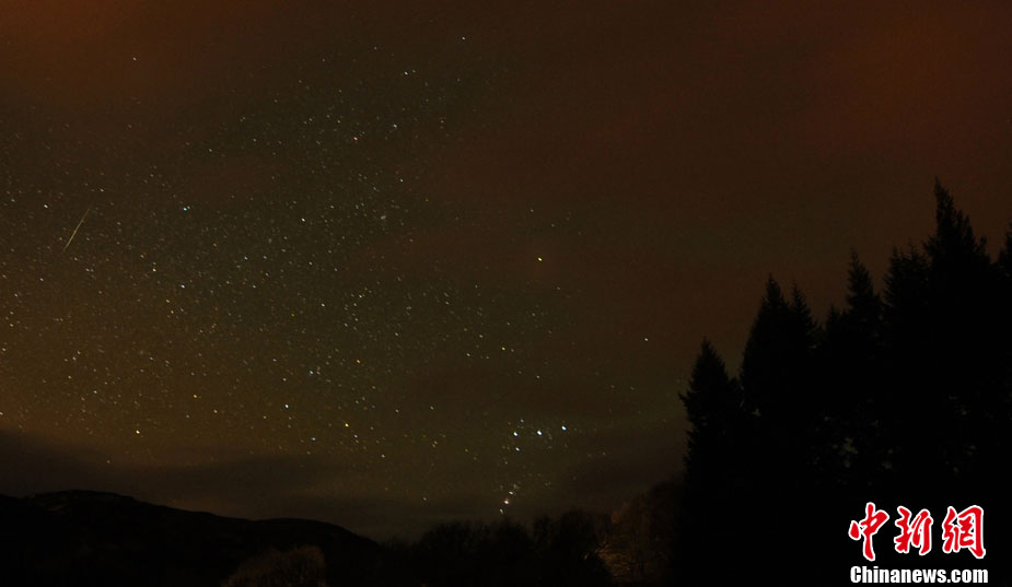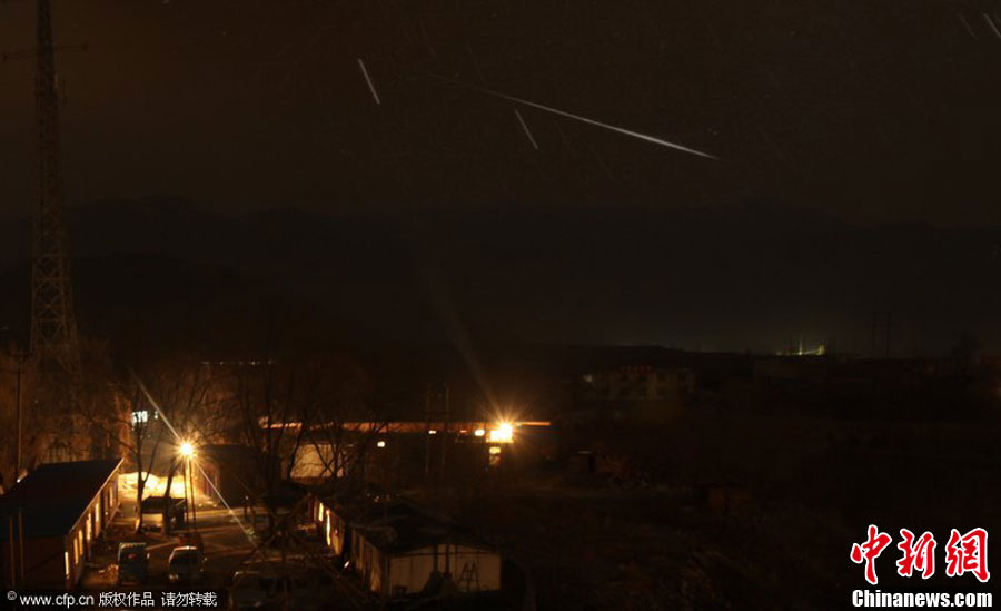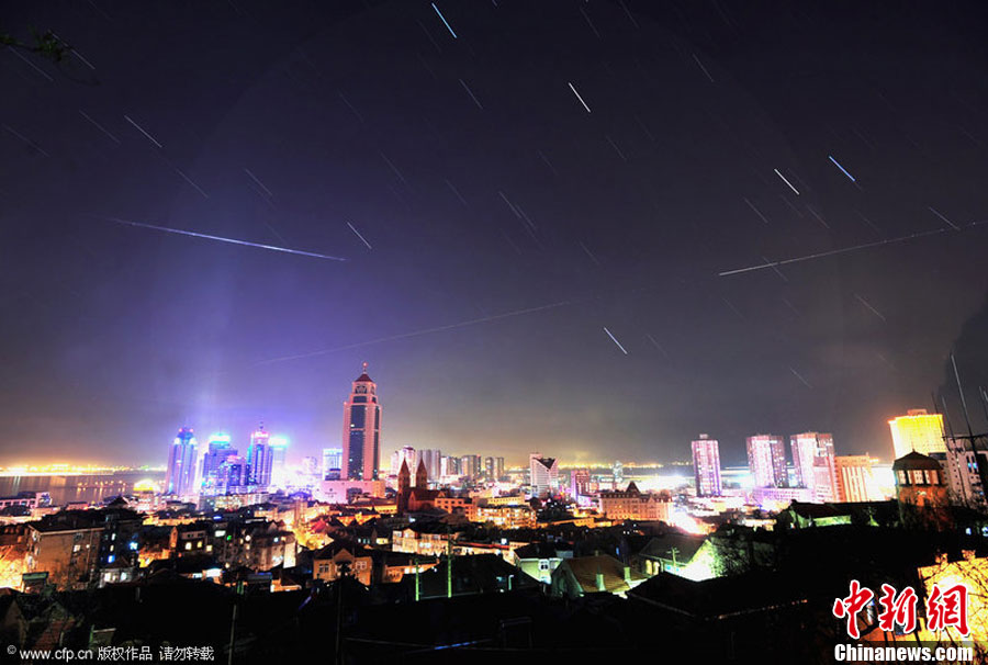 临近岁末,双子座流星雨如期而至。12月14日19时,双子座流星雨达到极大,每小时流星量达120颗。图为山东青岛栈桥景区上空明亮的流星从双子星座辐射而出,划过城市上空。周昆 摄 图片来源:CFP视觉中国