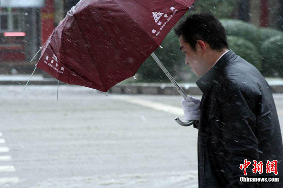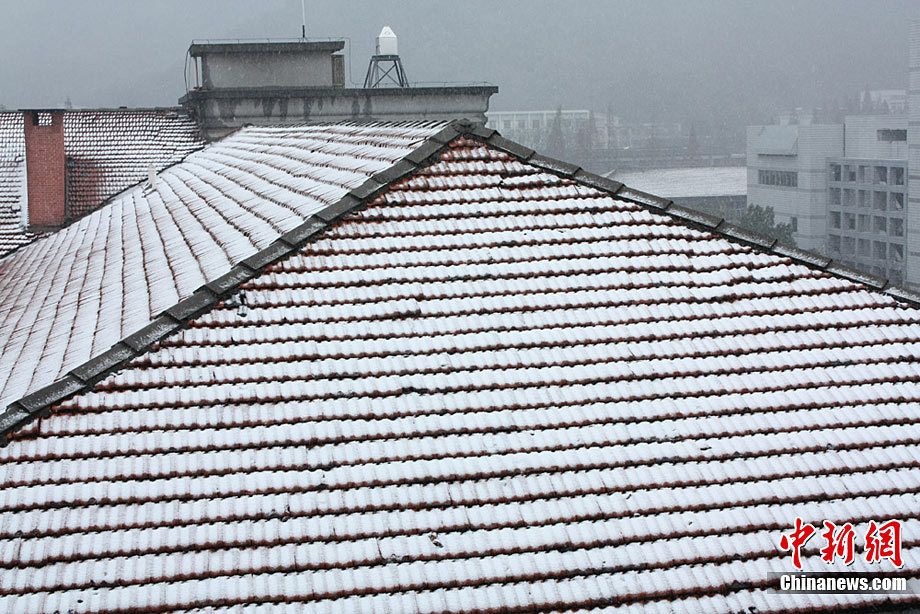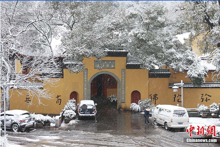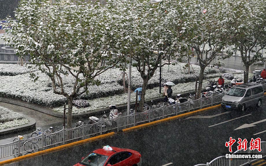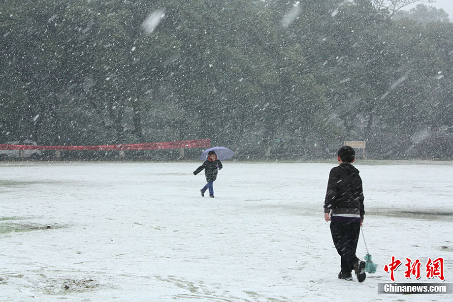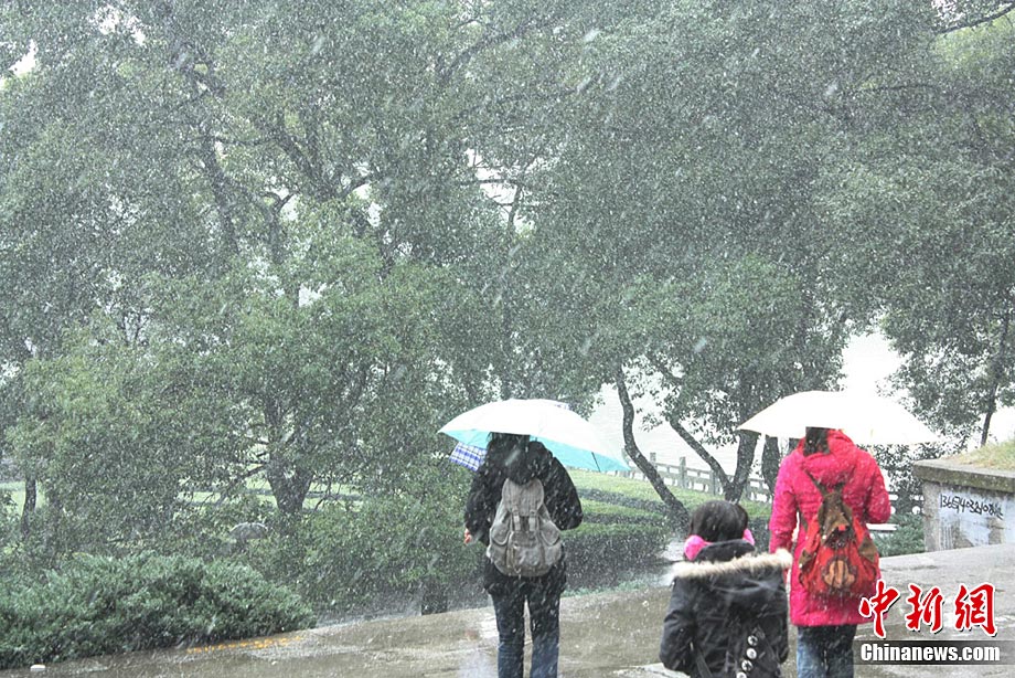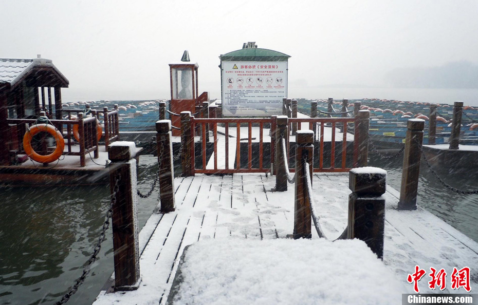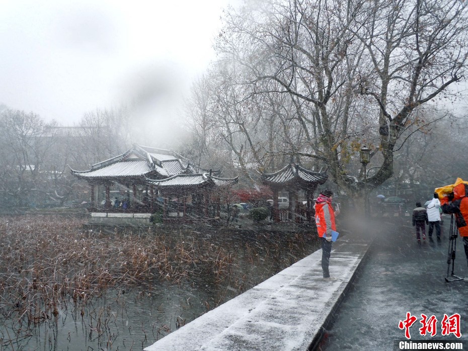 12月15日,杭州西湖上空飘起鹅毛般的雪花。据杭州市气象台发布的降温报告,杭州最低气温已经下降到2.5度,并伴有5至6级偏北风和明显降雪天气过程。中新社发 郦叶 摄