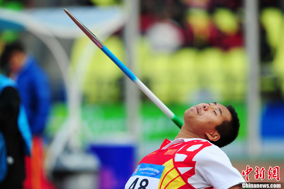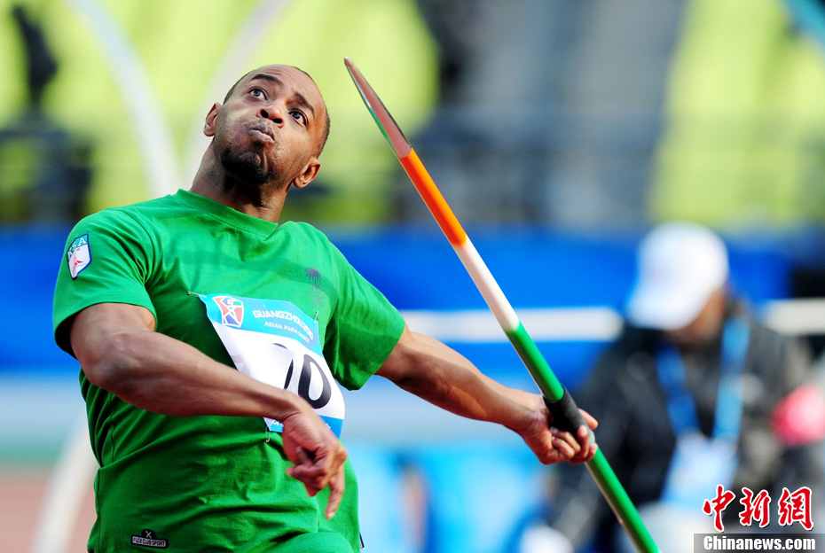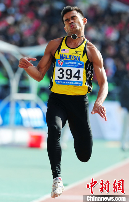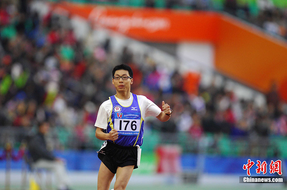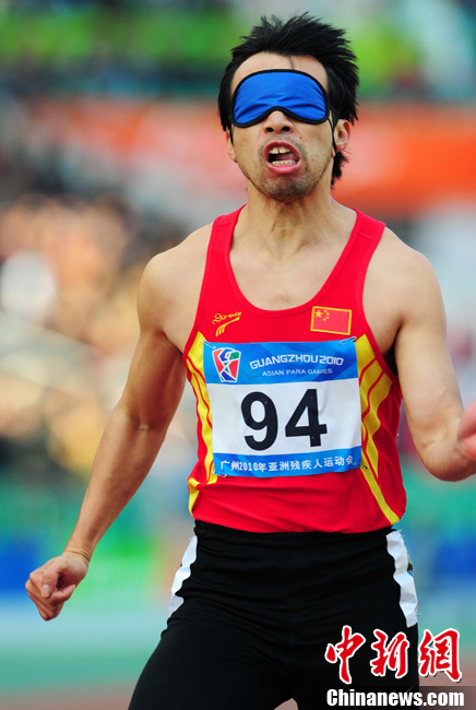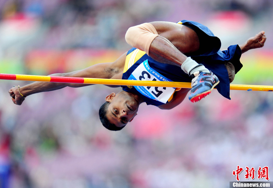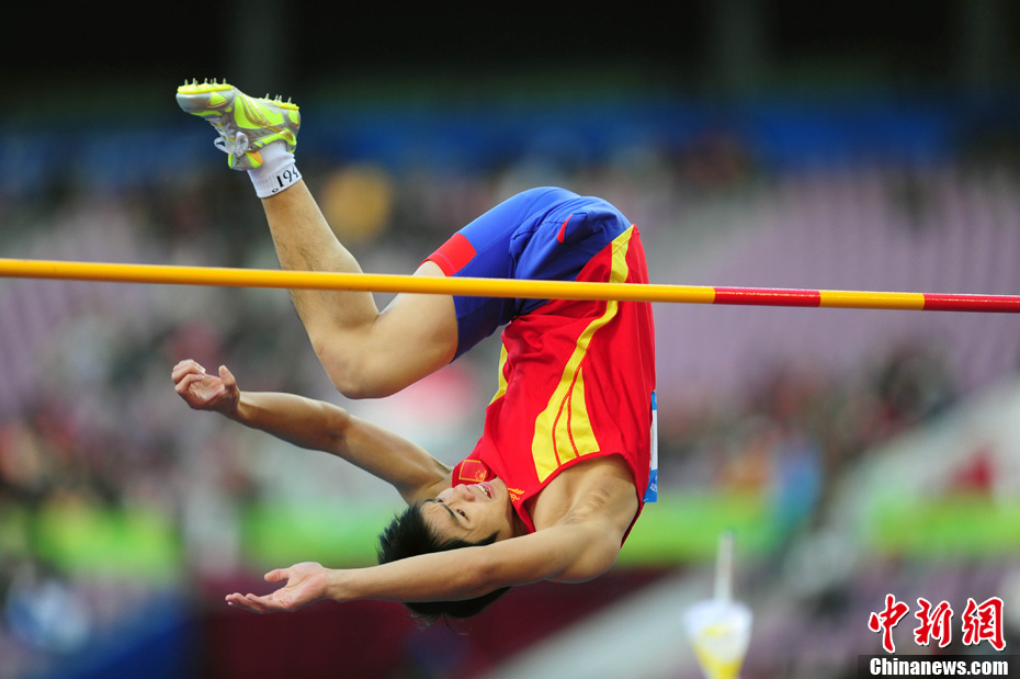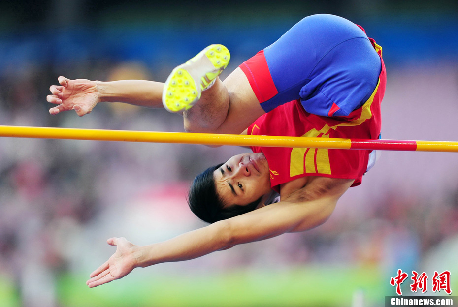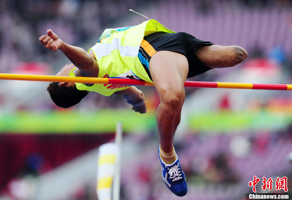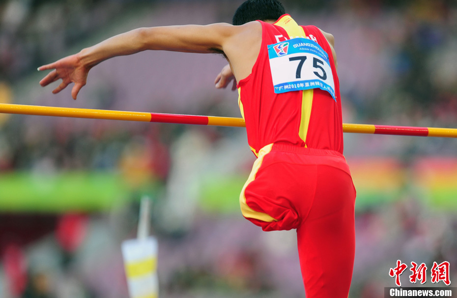 12月16日,广州2010年亚残运会田径赛进入第3天,广州遭遇寒流来袭气温降到最低2度,最高气温仅7度,亚洲选手在寒冷的气候条件下参赛。图为中国跳高选手李小文在比赛中。中新社记者 陈文 摄