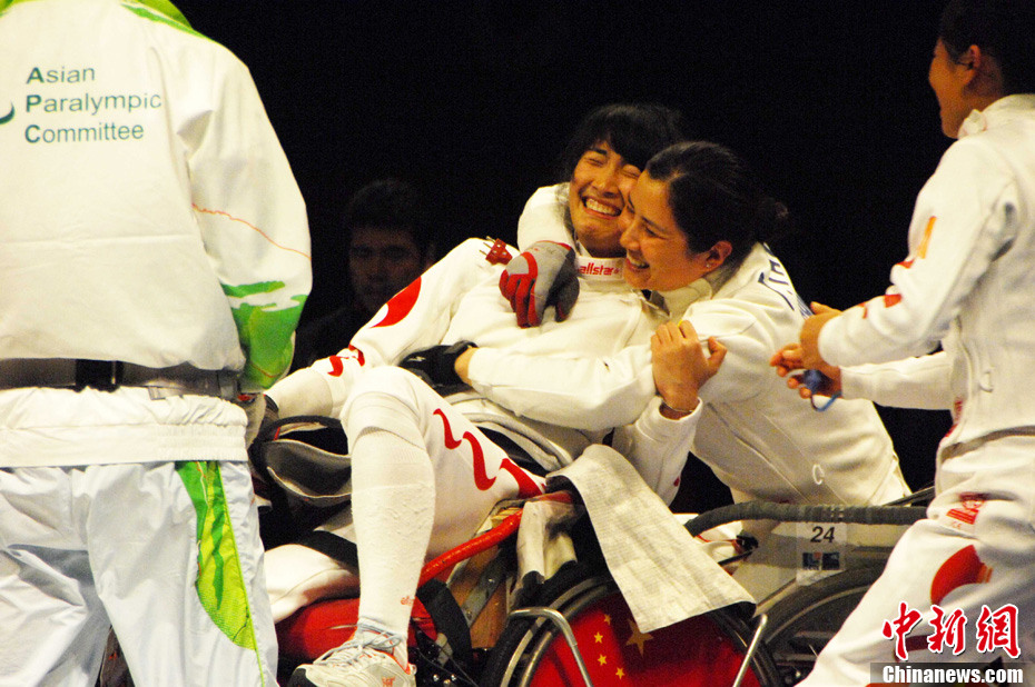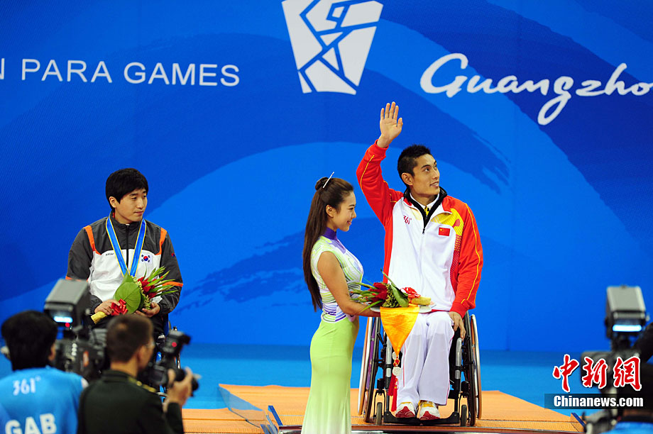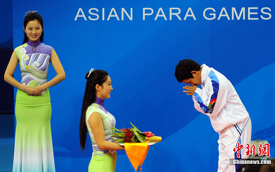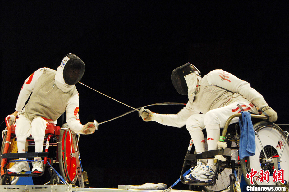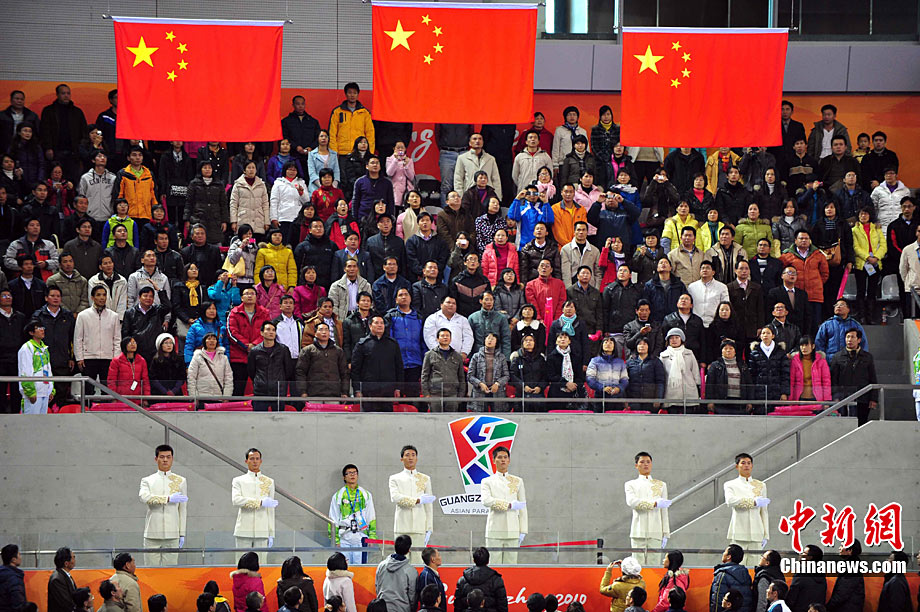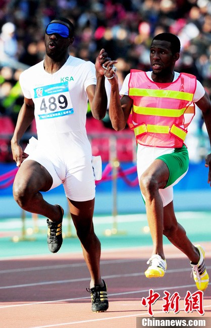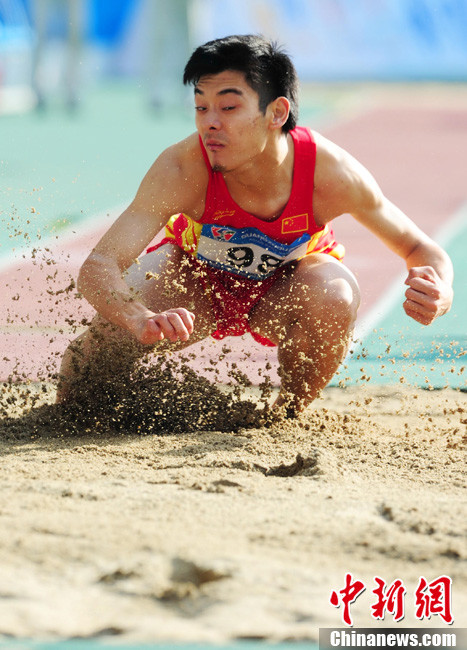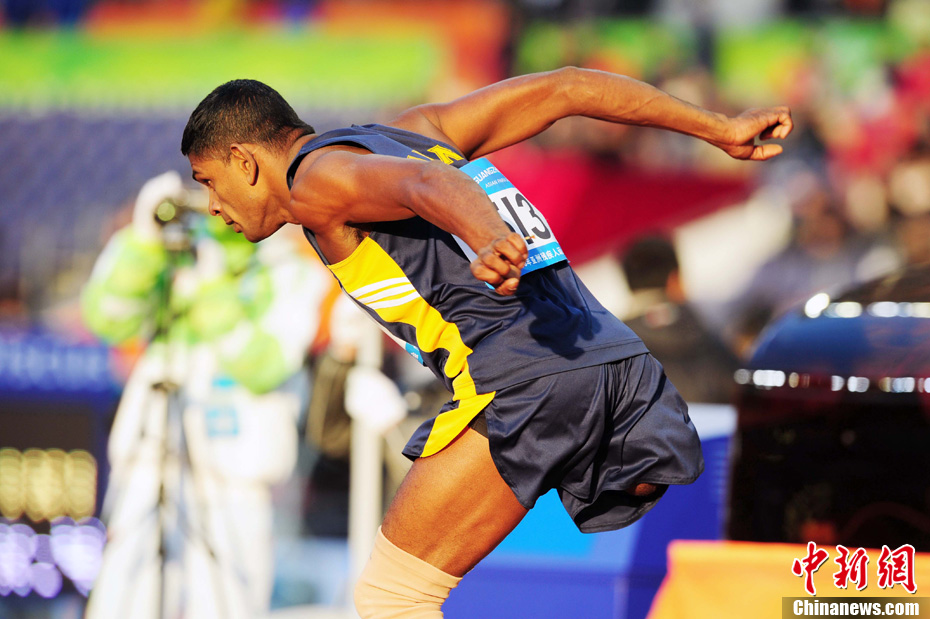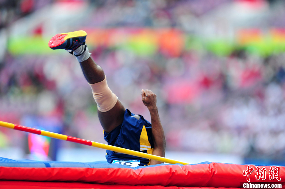 12月16日,广州2010年亚残运会田径赛进入第3天,广州遭遇寒流来袭气温降到最低2度,最高气温仅7度,亚洲选手在寒冷的气候条件下参赛。图为中国跳高选手李小文在比赛中。中新社记者 陈文 摄