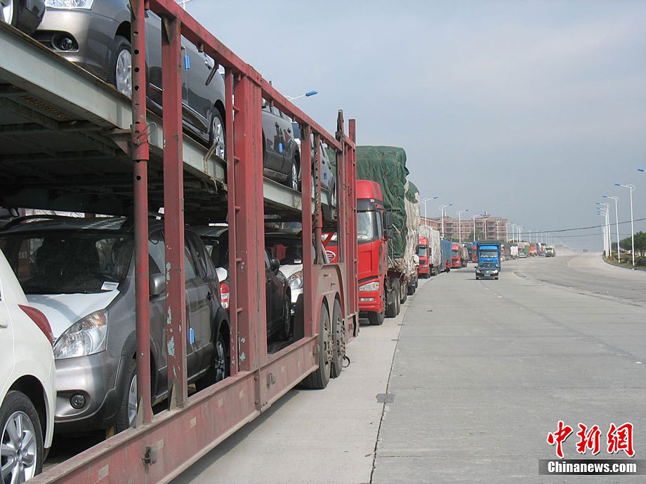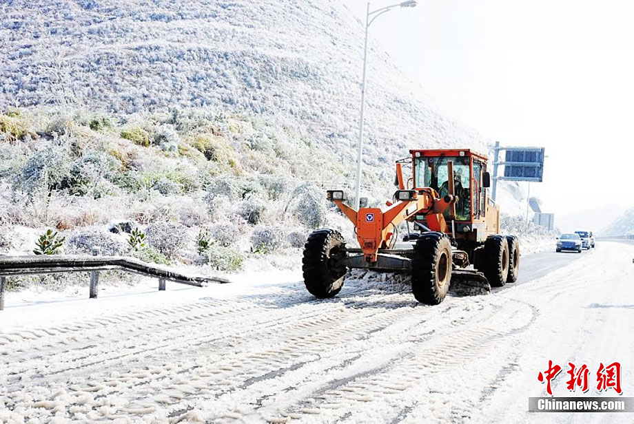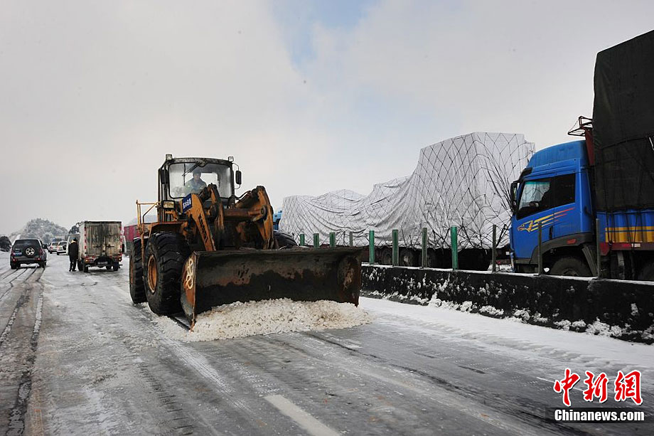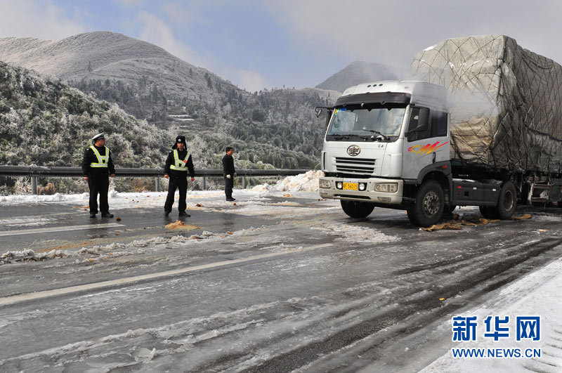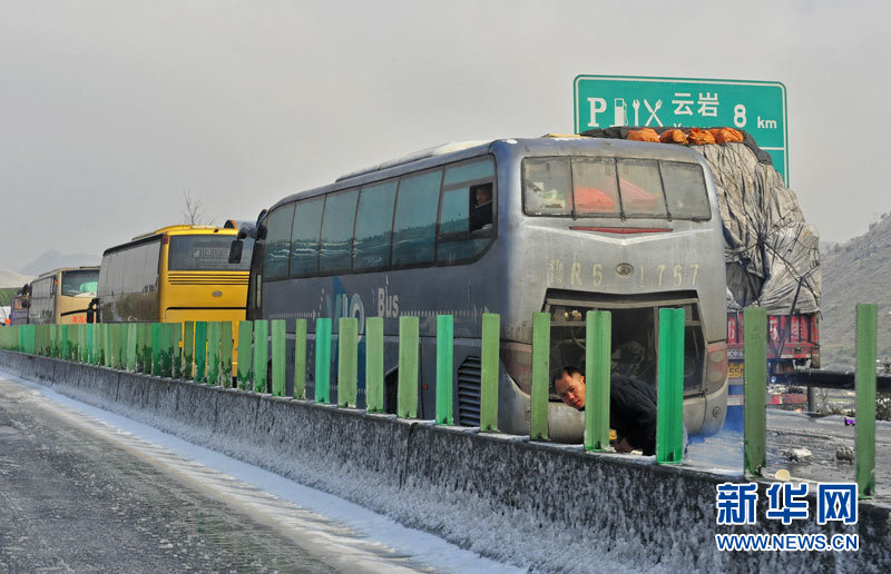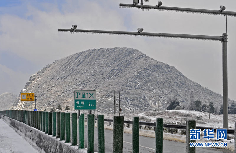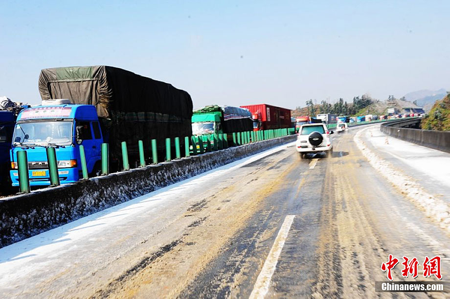 受强冷空气南下影响,广东北部山区气温降至零下,境内的京港澳高速乳源段和坪乳公路路面结冰,交通从12月16日凌晨开始中断,大量车辆滞留。经全力抗冰抢险,相关路段于16日14时许恢复正常通行。17日,已抢通的京港澳高速公路粤北段路面再次结冰,车辆滞留10公里。李凌 摄