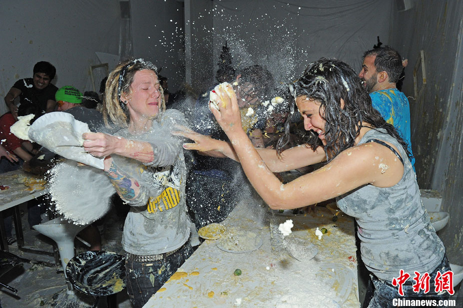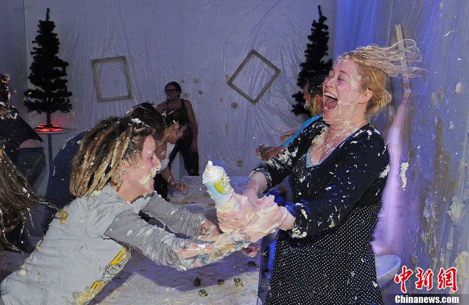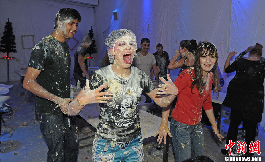 2010年12月18日,人们在英国伦敦一家画廊中参加圣诞食物大战活动。在活动中人们用甘蓝、土豆泥、果冻及奶油等食品互相“攻击”,此活动的门票收入将捐献给慈善机构。