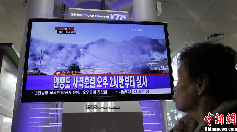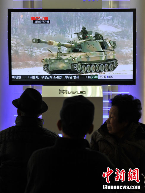 12月20日,韩国军方开始在延坪岛举行海上实弹射击训练。图为韩国民众在电视上收看演习训练的新闻。