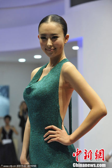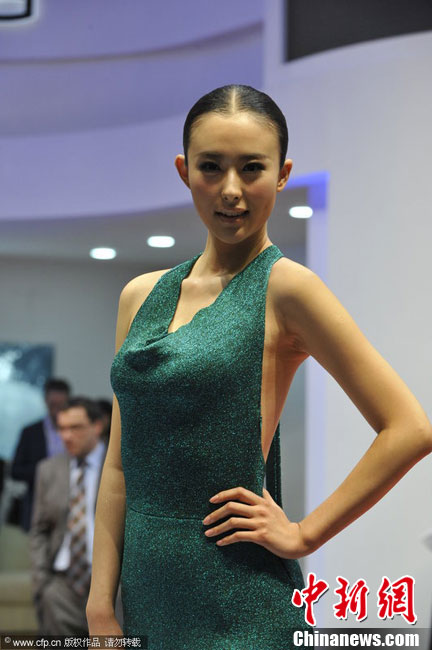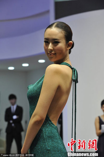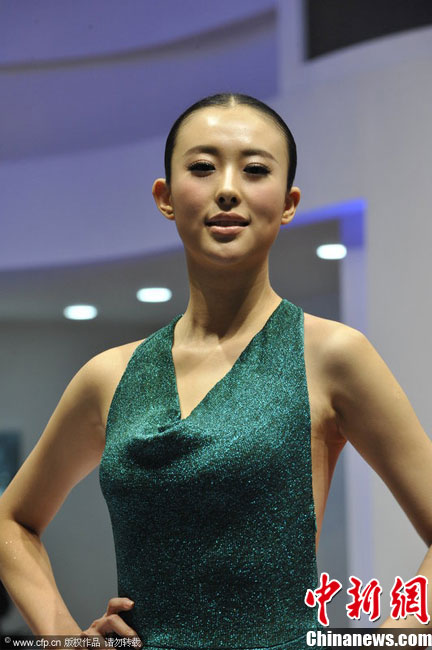 12月20日,2010广州车展举行,淡出车展许久的名模“兽兽”翟凌助阵西班牙超级跑车展台。一袭露背绿裙的她惊艳全场。江心 摄 图片来源:CFP视觉中国