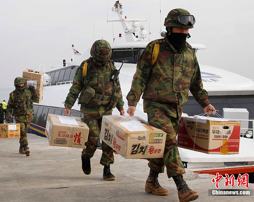 12月21日,韩国,居民和士兵乘船抵达延坪岛港口。当日,仁川港前往延坪岛的航线重开。图为复航后首艘民用船只抵达延坪岛。