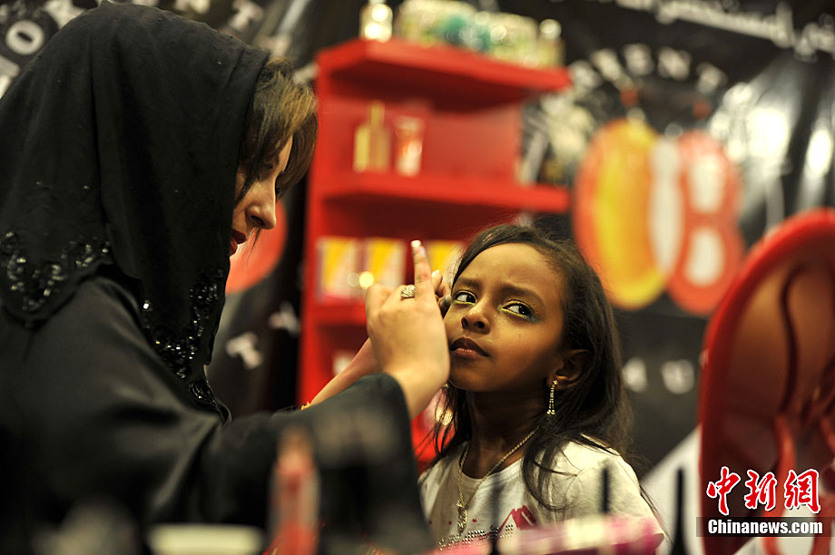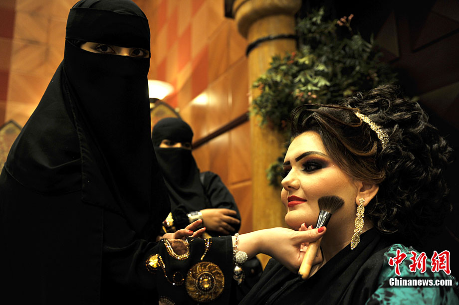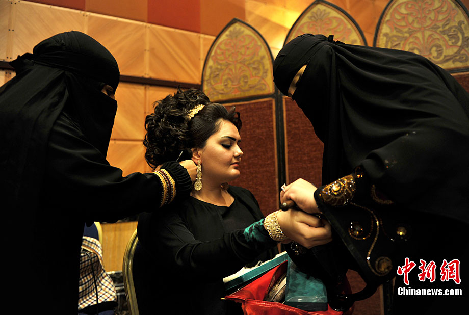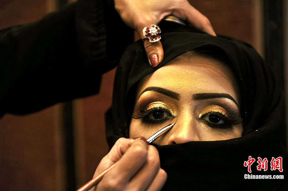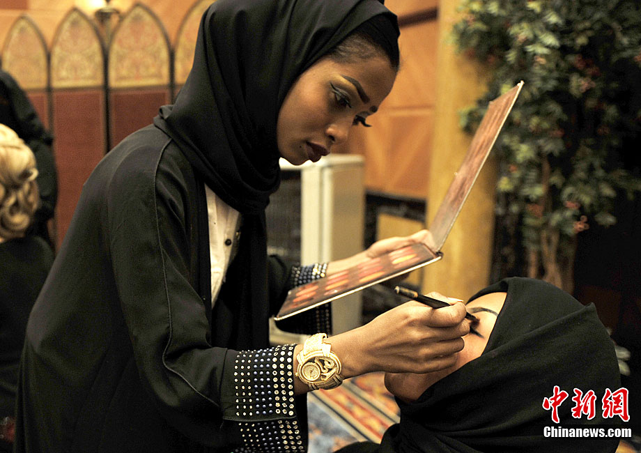 当地时间12月21晚,沙特2010化妆用品博览会在沙特阿拉伯的吉达市举行,此次博览会为期四天。图为沙特妇女在博览会上进行现场化妆。