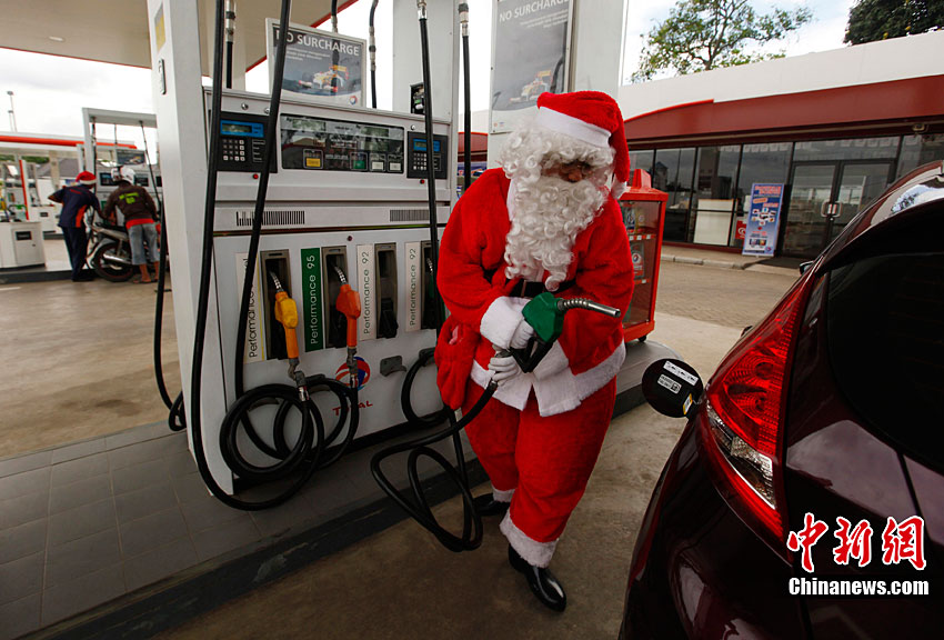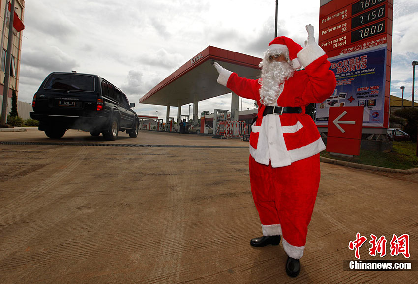 12月23日,印度尼西亚坦格朗市的一座加油站内,工作人员身着圣诞老人的服装,为过往车辆加油、洗车。