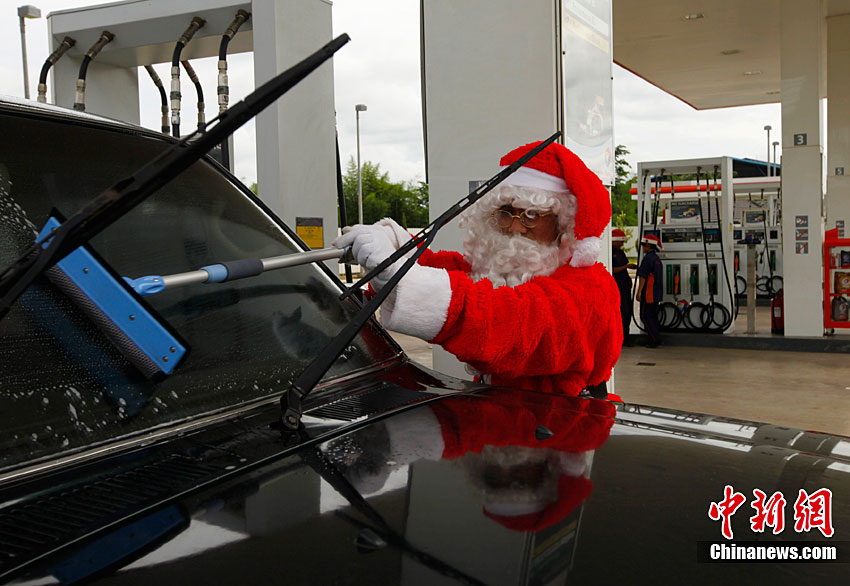 圣诞老人为过往车辆加油洗车