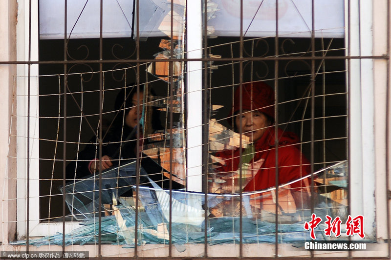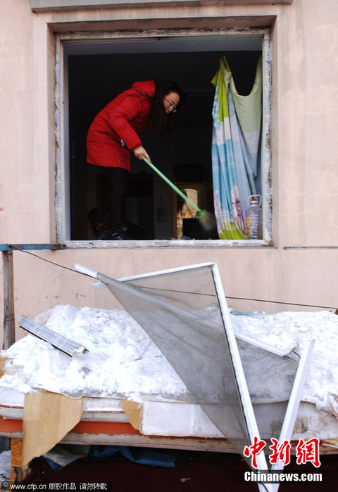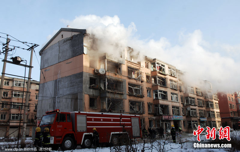 2010年12月24日早,吉林市徐州路附近一住宅小区发生天然气爆炸。据悉,爆炸波及6栋居民楼,约千余居民转移,有几名重伤者已送往医院,具体伤亡情况正在统计中。图为爆炸楼房浓烟滚滚,消防官兵进入楼内探查情况。图片来源:CFP视觉中国