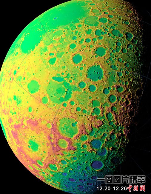 近日,美国航天局对外公布了月球勘测轨道飞行器携带的月球轨道飞行器激光测高仪(LOLA)对该地点进行的高度测量。科学家称,月球勘测轨道飞行器使研究者能制造出最精确且最完整的月球地形图。红色代表月球最高点,蓝色代表最低点。