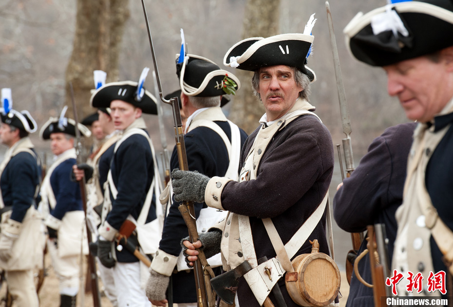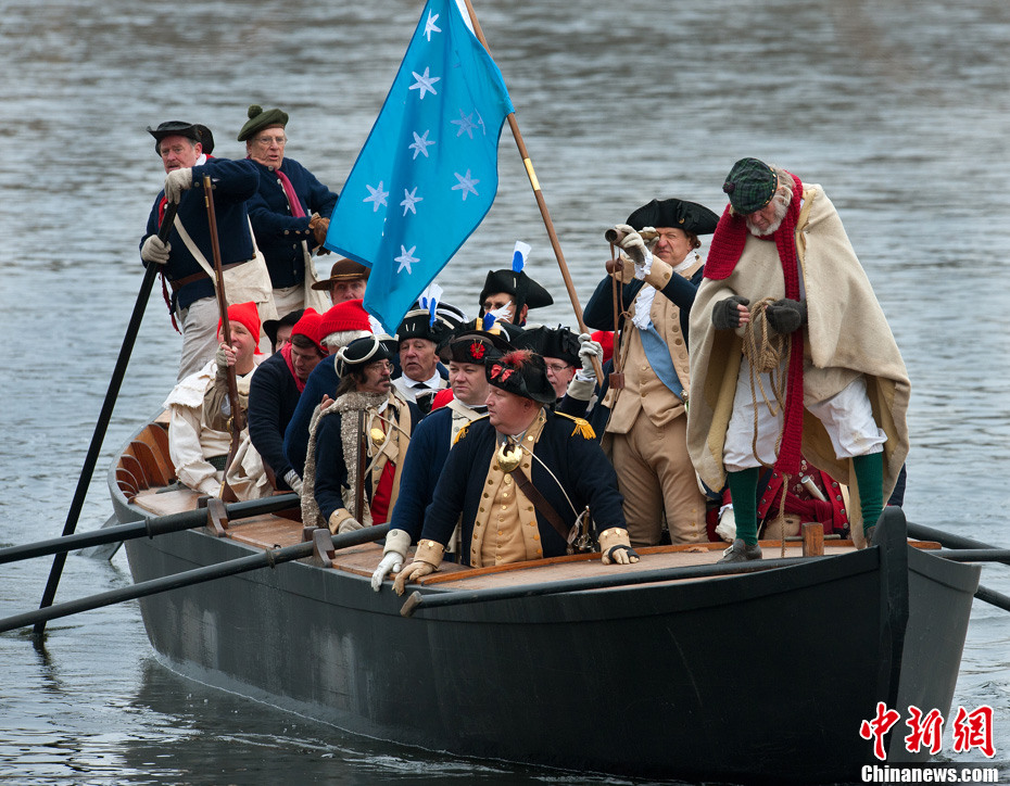 12月25日圣诞节,在美国宾夕法尼亚州华盛顿横渡历史公园,身着美国独立战争期间大陆军军装的“士兵们”在“乔治·华盛顿”(右二)的引领下乘船渡过特拉华河。
