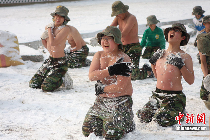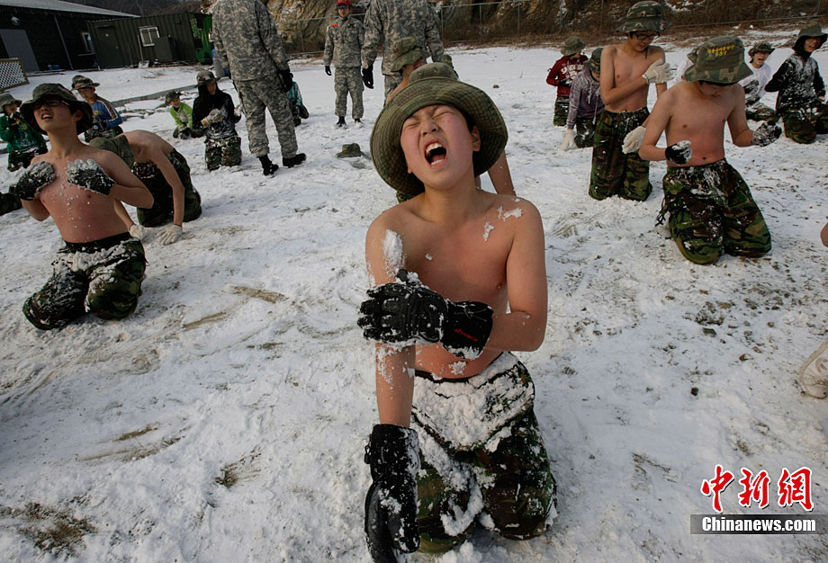 12月27日,韩国安山岛Daebu的新兵训练营内,部分韩国中小学生赤膊在雪地中进行军事训练。
