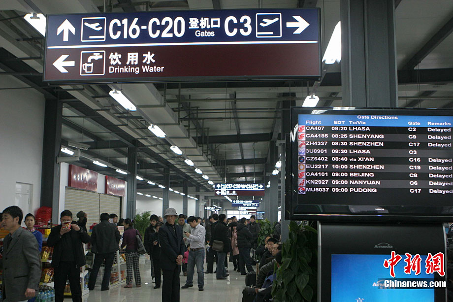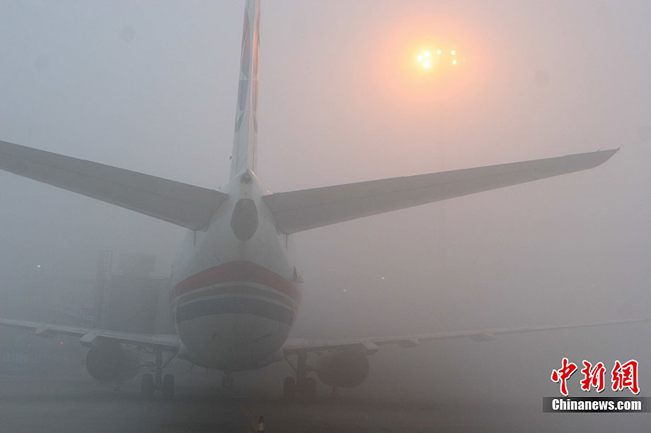 12月28日清晨3时左右,成都双流国际机场遭遇大雾天气袭击。受此影响,机场被迫关闭长达7个多小时。截至11时,大雾造成110个进出港航班延误,近万名出行旅客被困机场。中新社发 吕俊明 摄