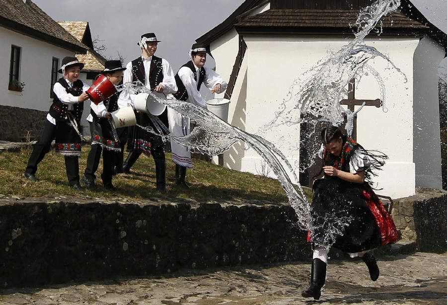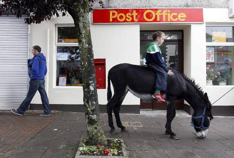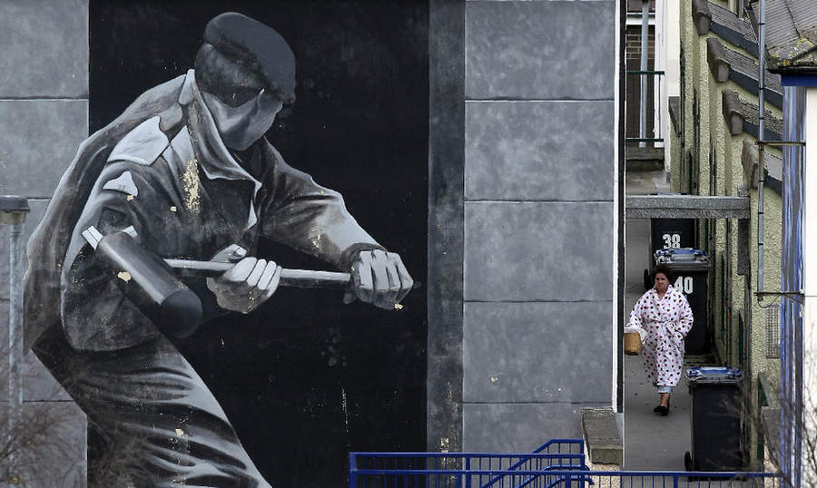 2010年3月23日,在爱尔兰北部的德里布,一名女子正在向外倒垃圾。旁边的壁画上,一名英国士兵正使用大锤子击倒一栋房子的大门。