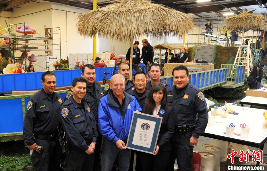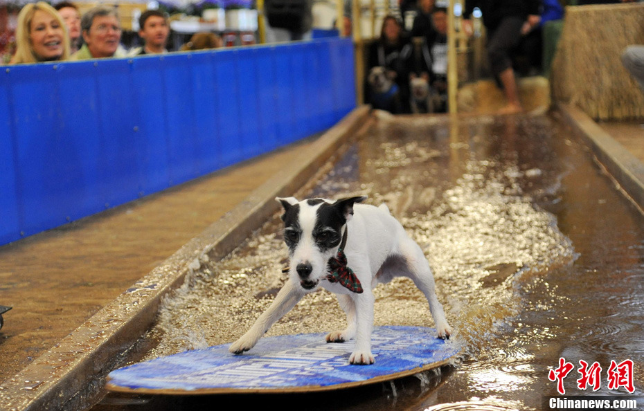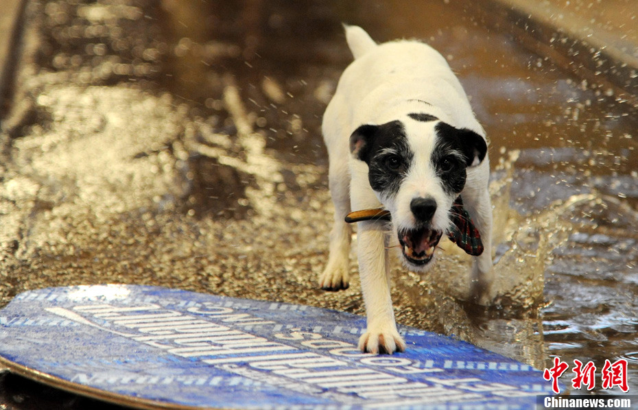 美国一家宠物食品公司推出的新年花车12月29日获得吉尼斯认证,成为世界上最重的单体花车。花车总重达到35吨,其中包括约15吨水。这辆花车将参加2011年元旦举行的第122届美国玫瑰花车大游行,届时十只宠物狗将在花车上表演冲浪、跳水等高难度动作。图为宠物狗冲浪彩排。中新社发 张炜 摄
