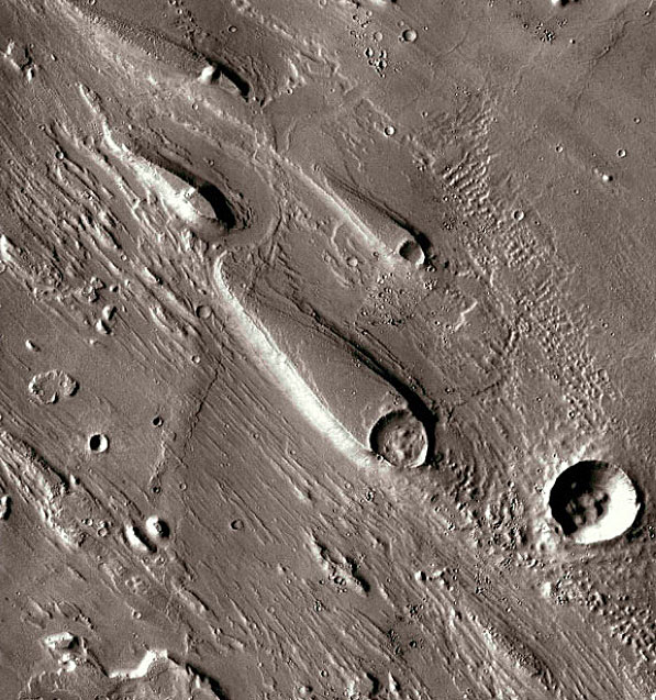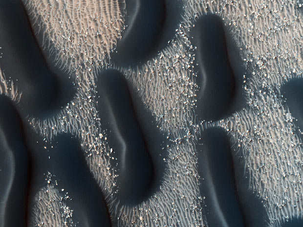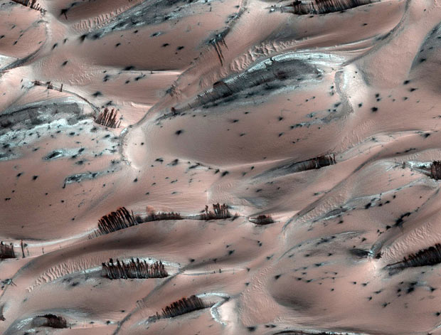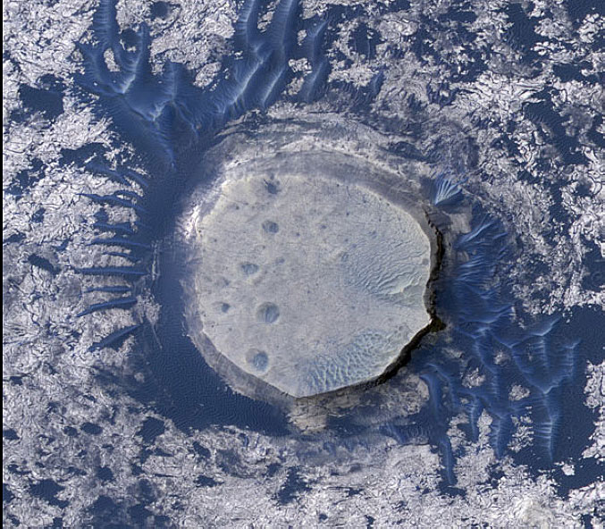 美国宇航局“火星侦察轨道器”在火星“阿拉比亚陆地平原”地区,拍摄到的奇怪陨石弹坑。自从2006年以来,“火星侦察轨道器”已经发回100兆兆位的信息,相当于MP3中存了300万首歌。