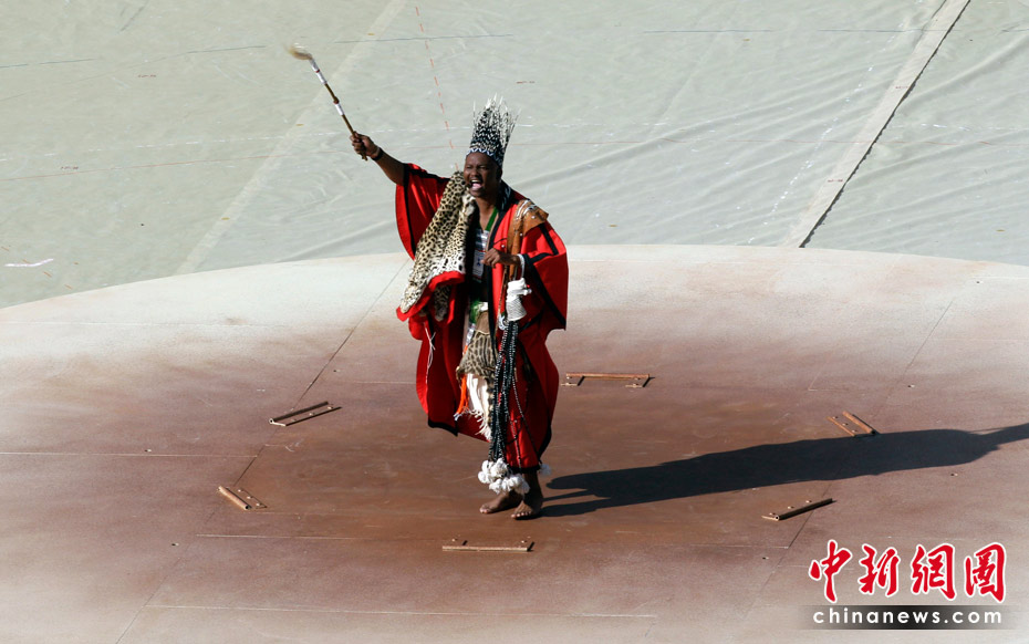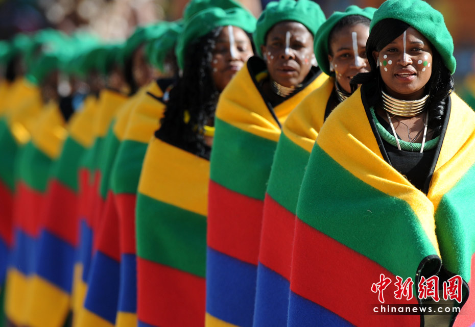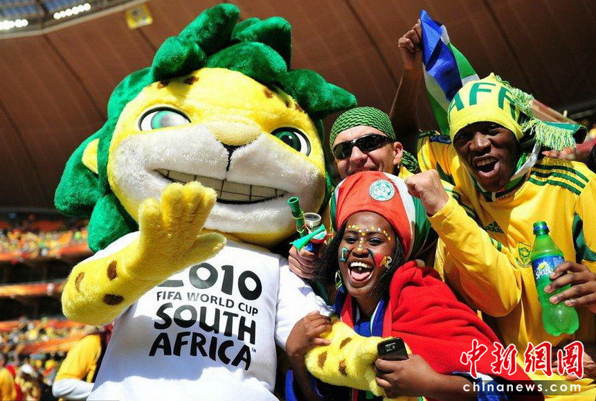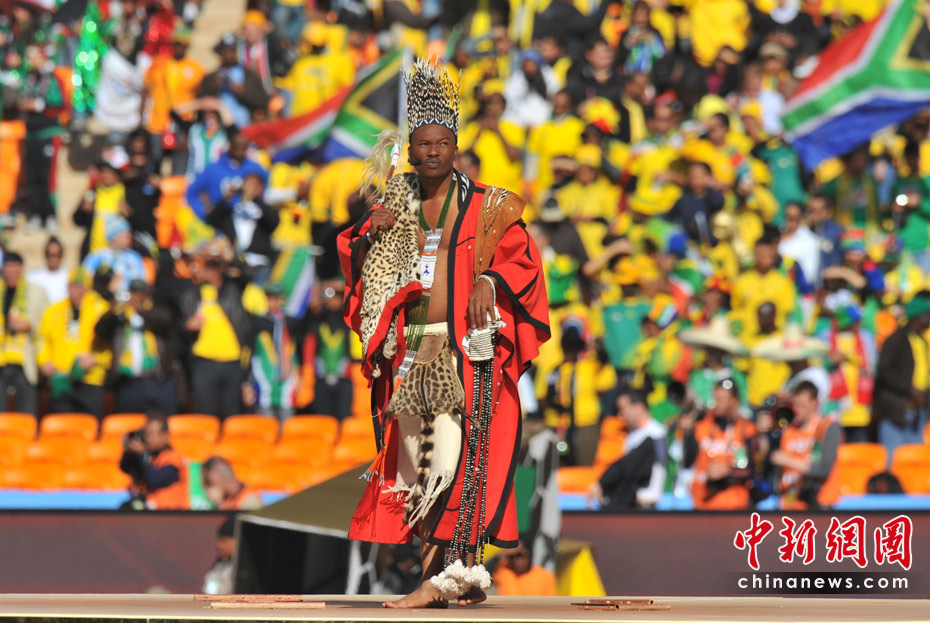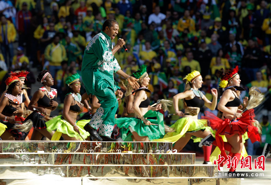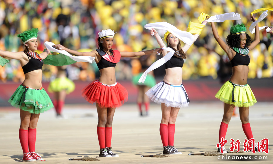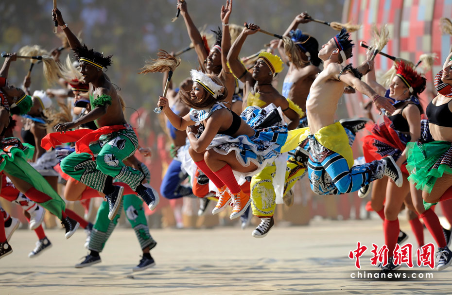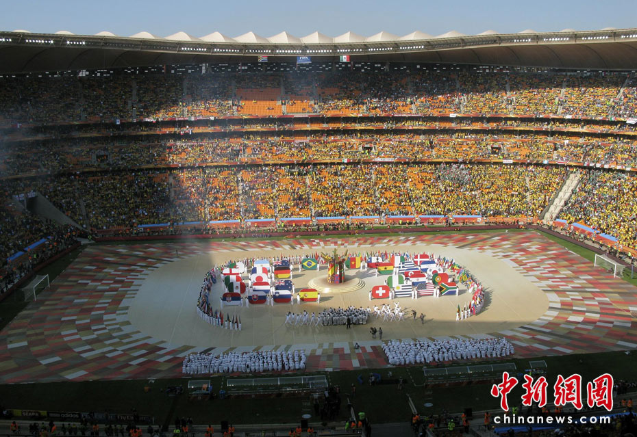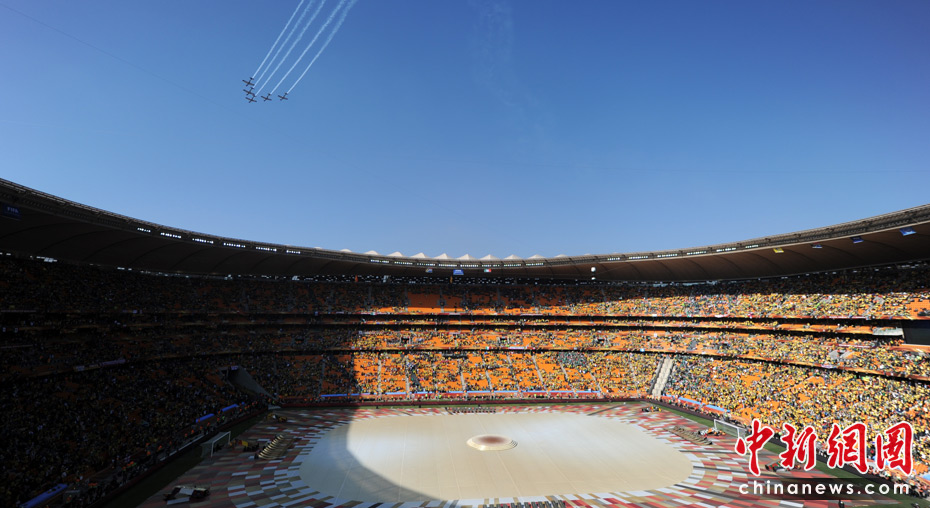 北京时间11日晚8时10分,南非世界杯足球赛开幕仪式在约翰内斯堡的足球城体育场拉开帷幕。开幕仪式前,南非共和国的空军进行了飞行表演。五架飞机在世界杯赛场滑翔而过。