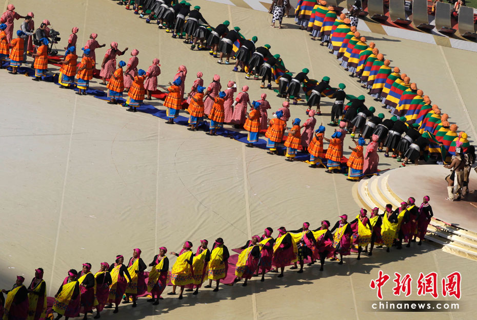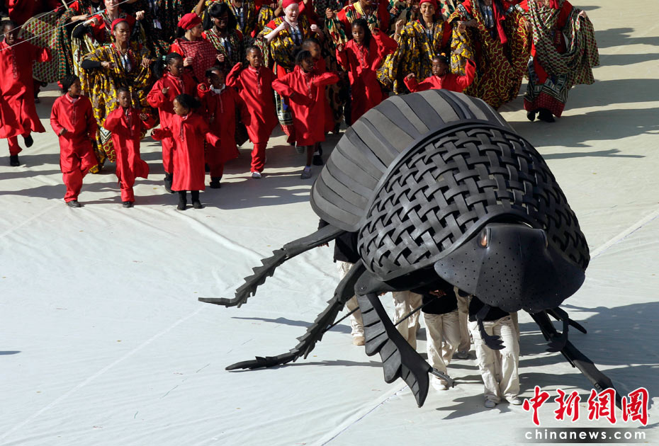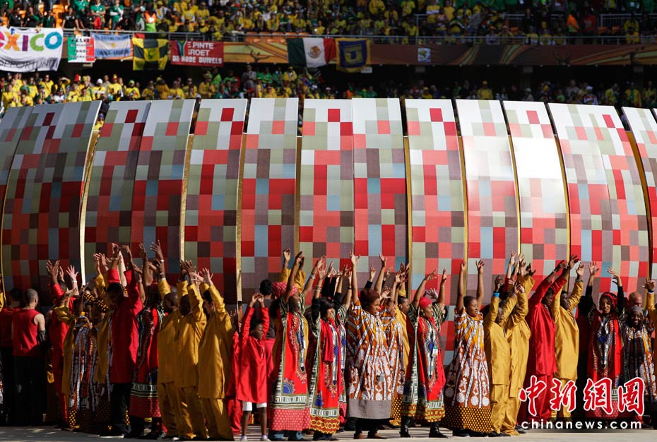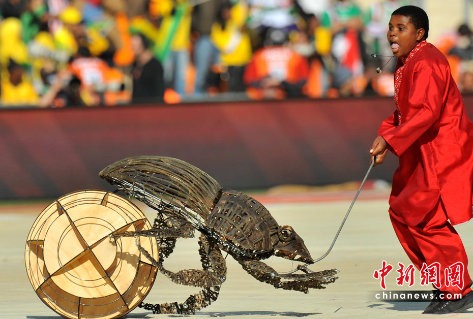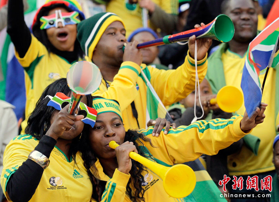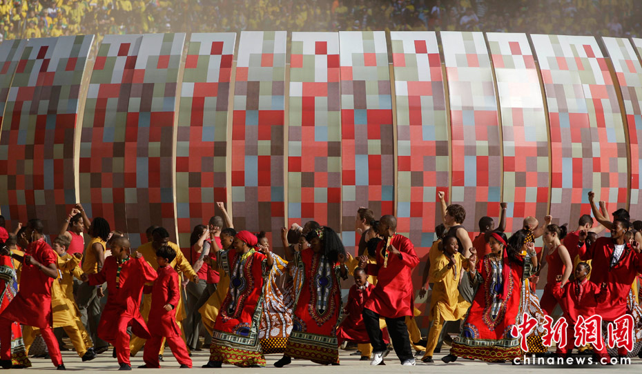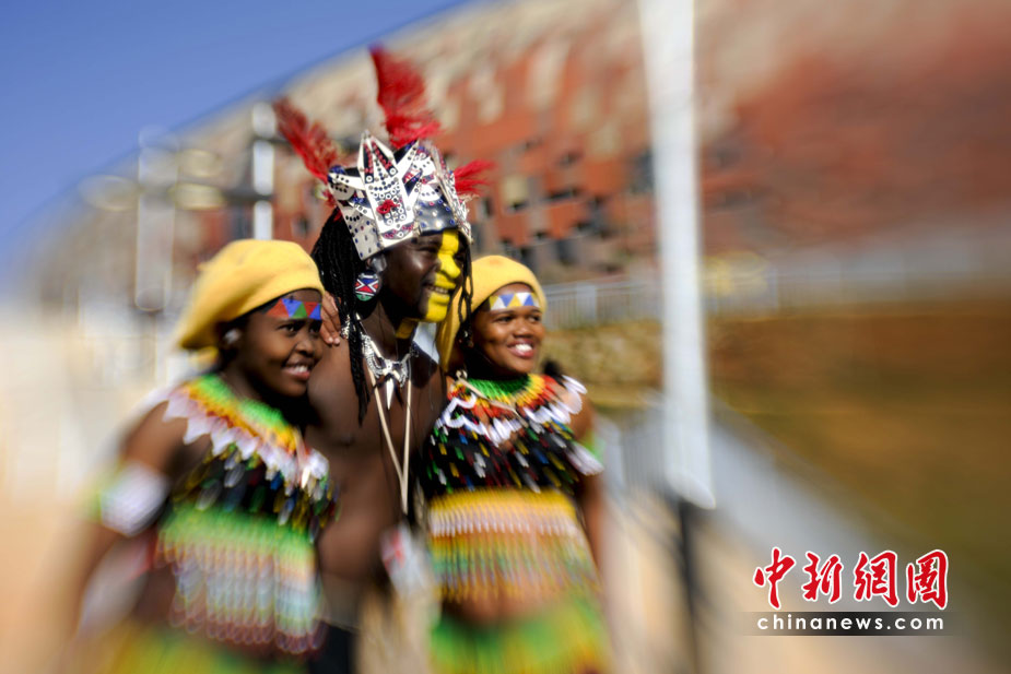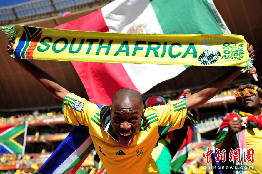 北京时间11日晚8时10分,南非世界杯足球赛开幕仪式在约翰内斯堡的足球城体育场拉开帷幕。开幕仪式前,南非共和国的空军进行了飞行表演。五架飞机在世界杯赛场滑翔而过。