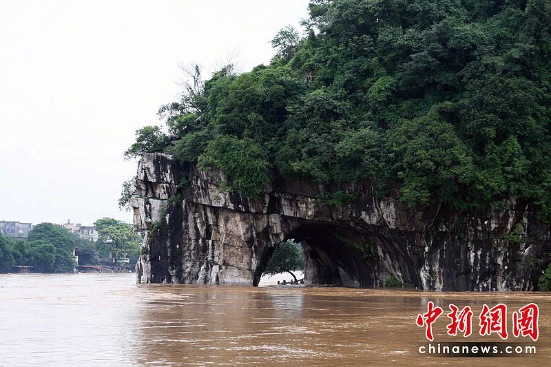 2010年6月17日,广西桂林市出现大到暴雨、局部大暴雨天气。漓江洪水倒流入市区,市民坐竹排出行。东华/CFP