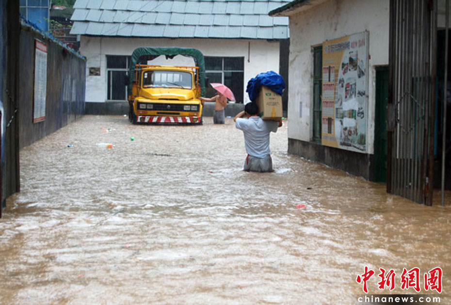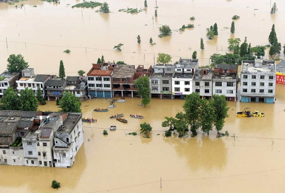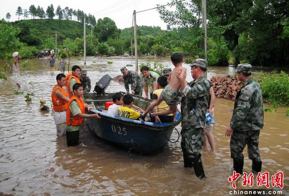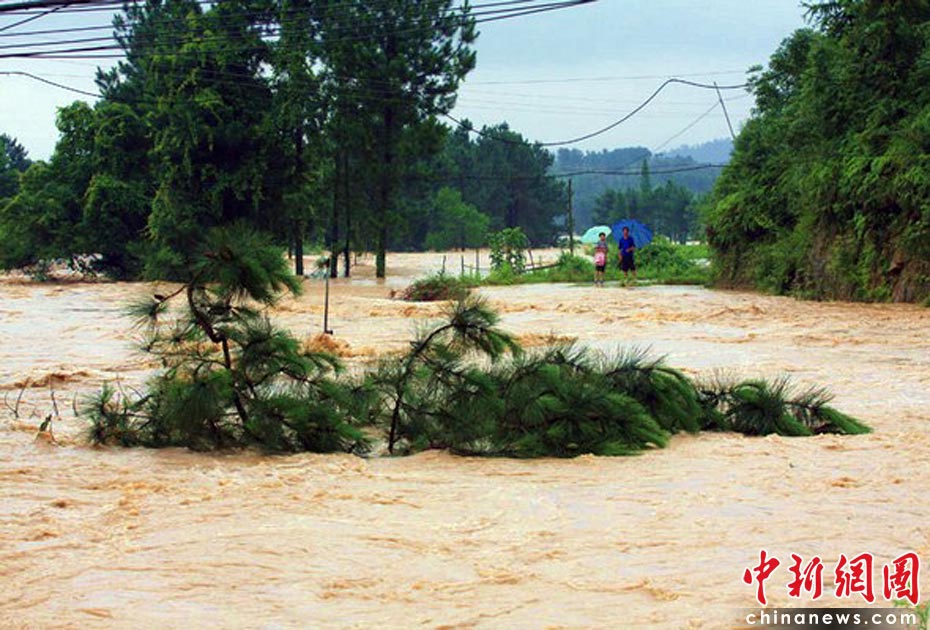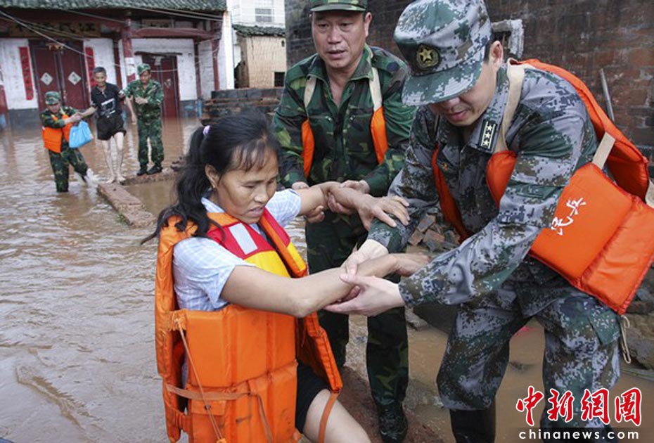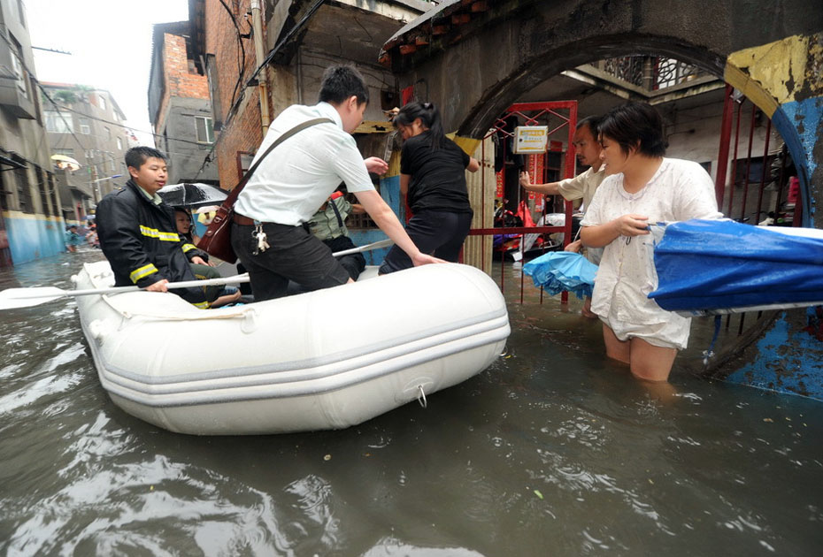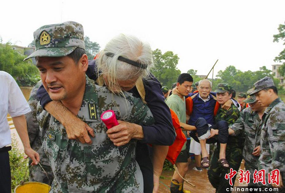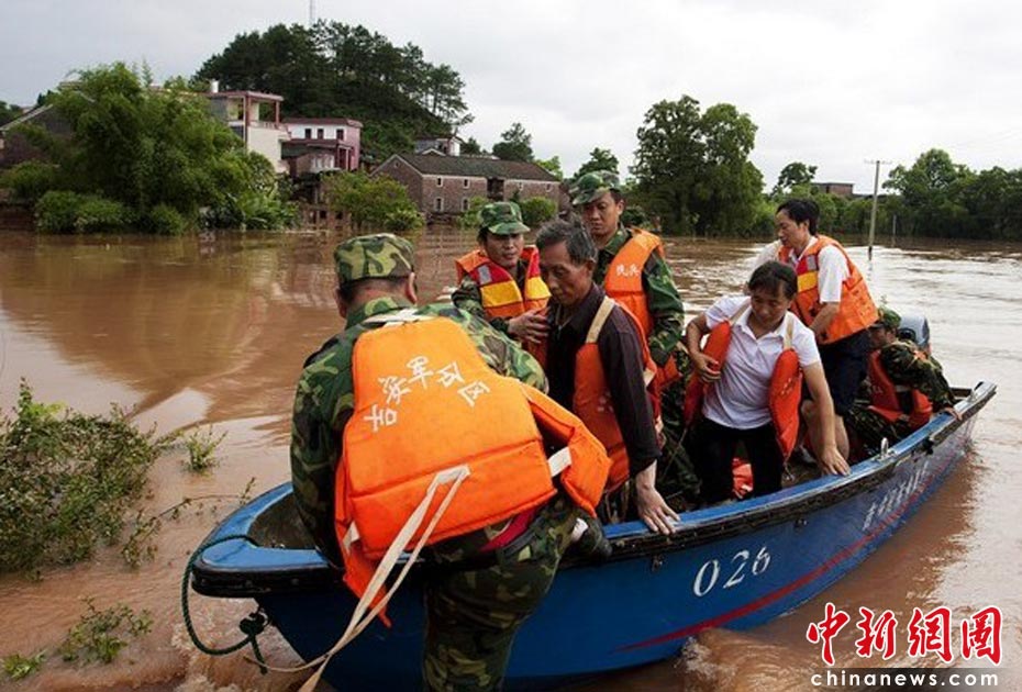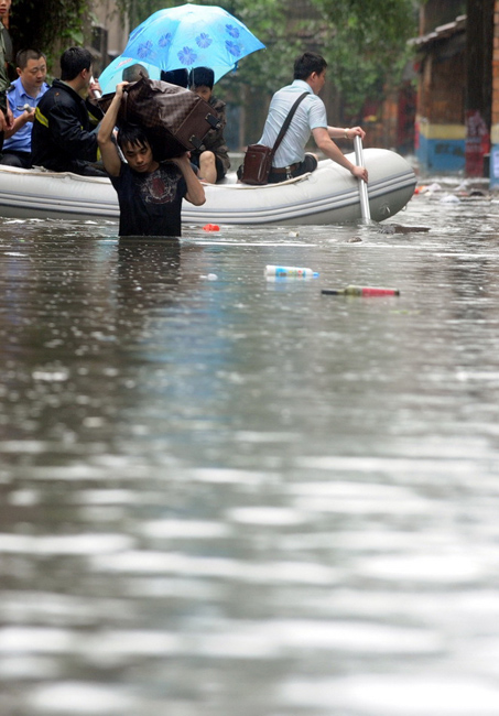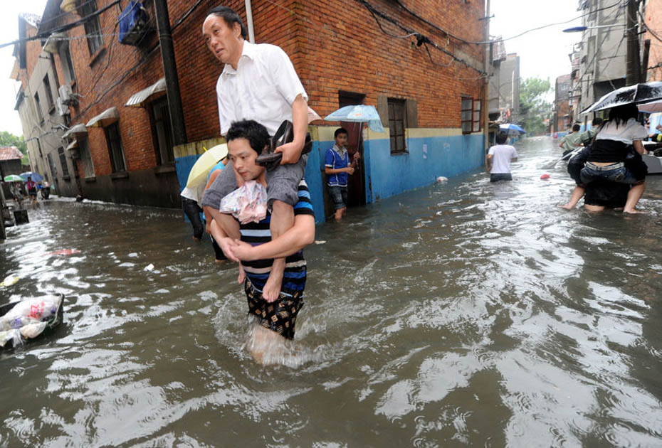 6月19日,在南昌市青云谱区狮子口村,村民扛着家人涉水前行。图片来源:新华网